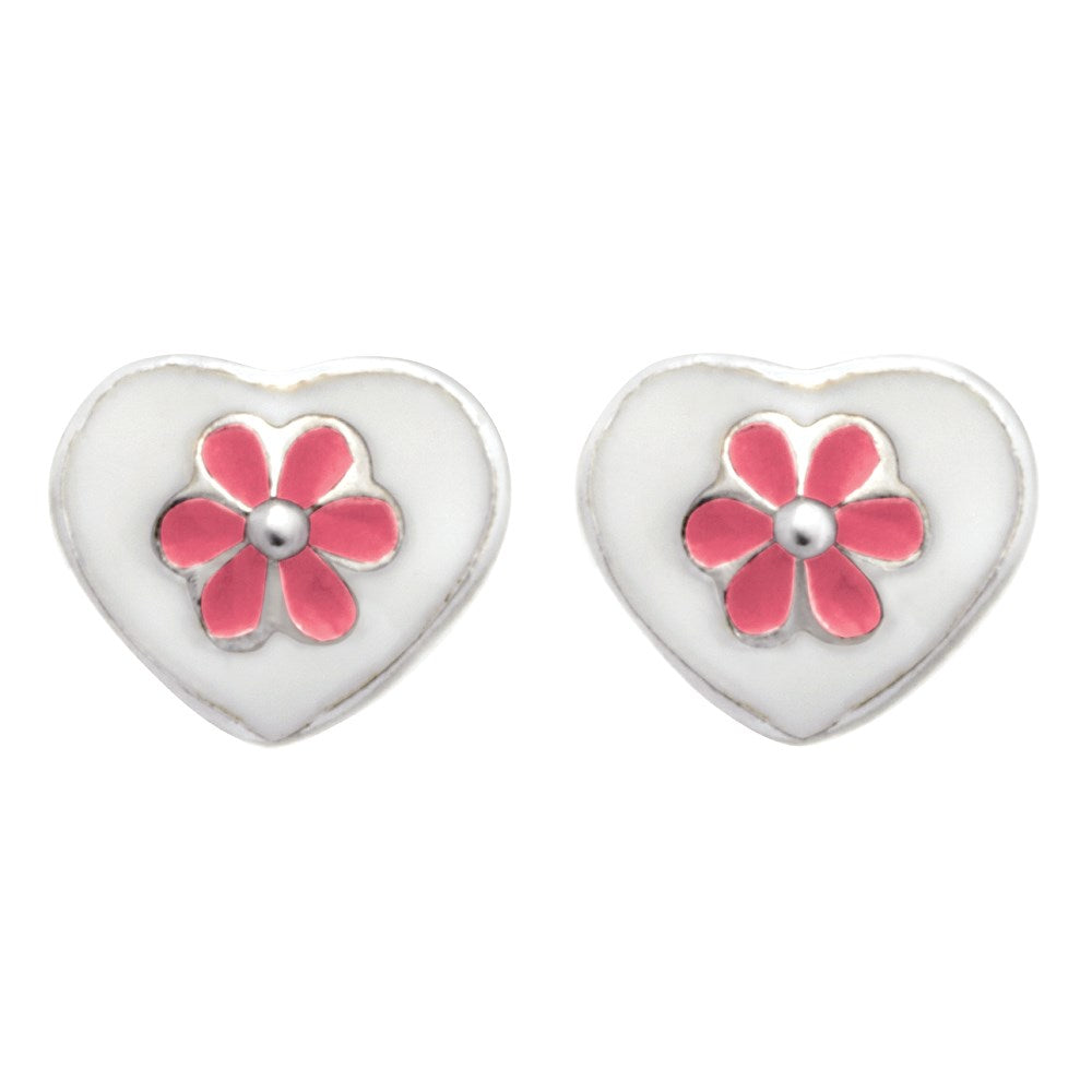 Rhod. sølvørestikker hjerte m/lyserød blomst