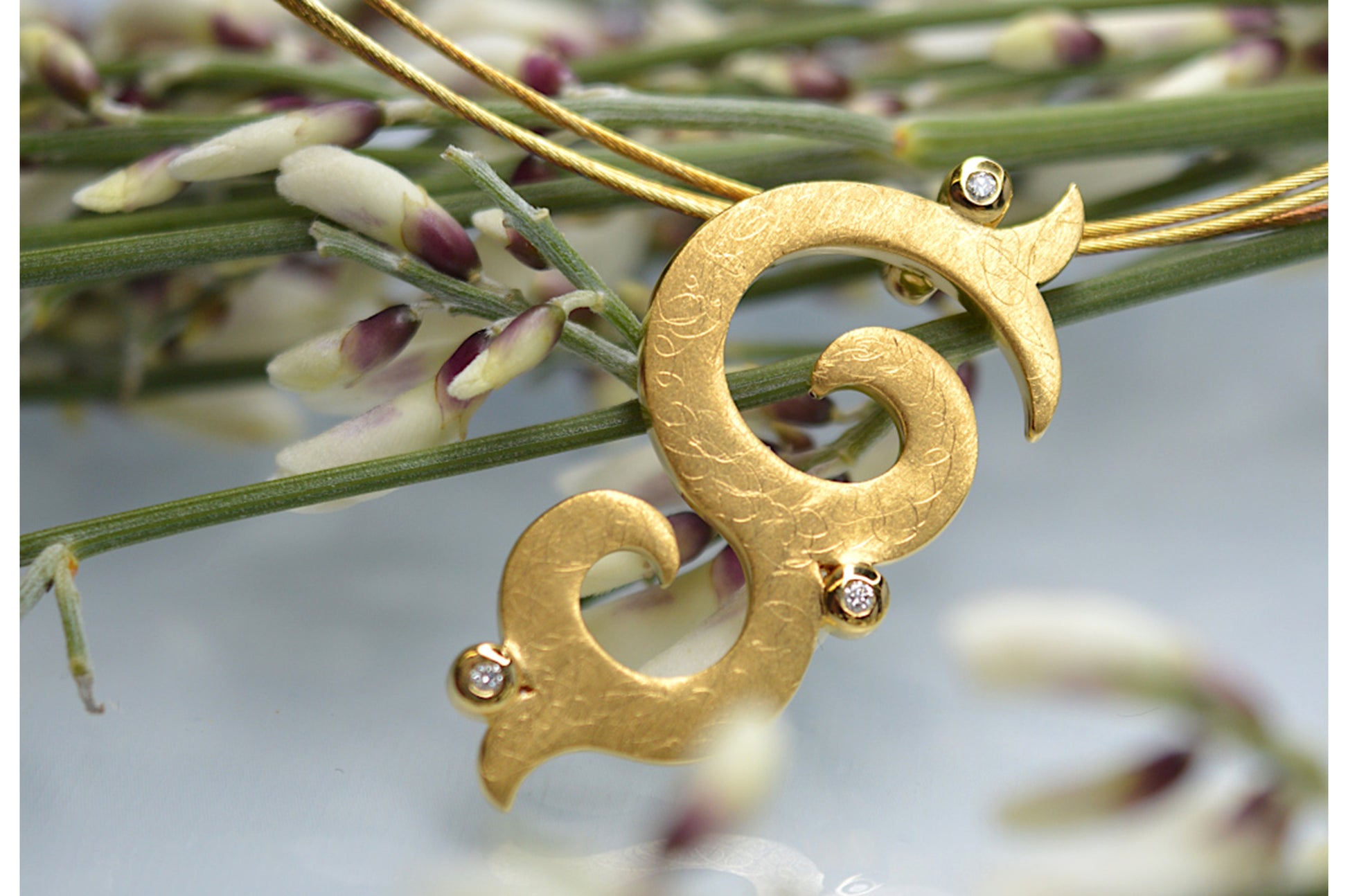 Sensuelt og feminint udseende vedhæng lavet af gult forgyldt 925/- sterlingsølv med en kradsemat overflade og polerede kanter. I alt 3 glitrende diamanter (W-SI) hver vejer 0,01 ct (0,03 ct i alt) i polerede rammer pryder dette vidunderlige smykke af designersmykker fra pennen af Düsseldorf smykkedesigner Nadine Resch. Vedhængets usynlige ophæng sikrer et særligt elegant udseende og sikrer, at vedhænget sidder fast og sikkert i bærerens décolleté. Fås med matchende øreringe og kan kombineres vidunderligt.