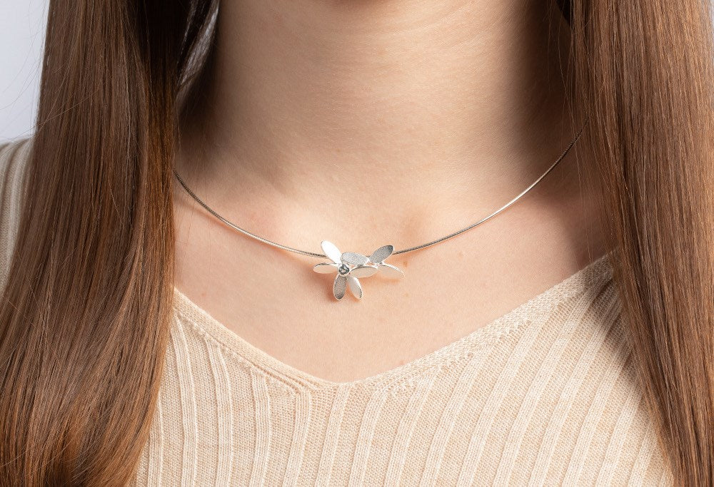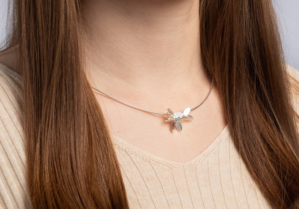 Vedhænget lavet af sandmattet 925/- sterling sølv, perfekt fremhævet af en asymmetrisk placeret blå topas (0,10 ct), imponerer med sit feminine og blomsterinspirerede designsprog. Smykket kan kombineres med mange outfits som en ægte allrounder. Fås med matchende ring og øreringe.