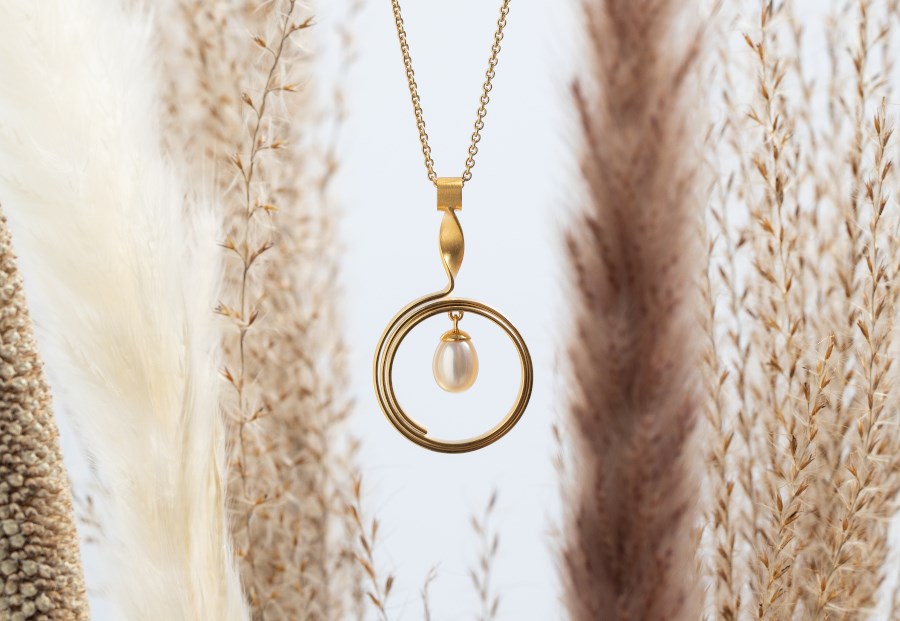 Det indpakkede og snoede vedhæng lavet af 18 karat forgyldt 925/- sterling sølv imponerer med sin karakteristiske form og en frit svingende kulturperle (3,12ct) i form af en dråbe i midten. Dette unikke designersmykke er skabt af Osnabrück-designeren Dietmar Sebastian. Ideel i kombination med de matchende øreringe.