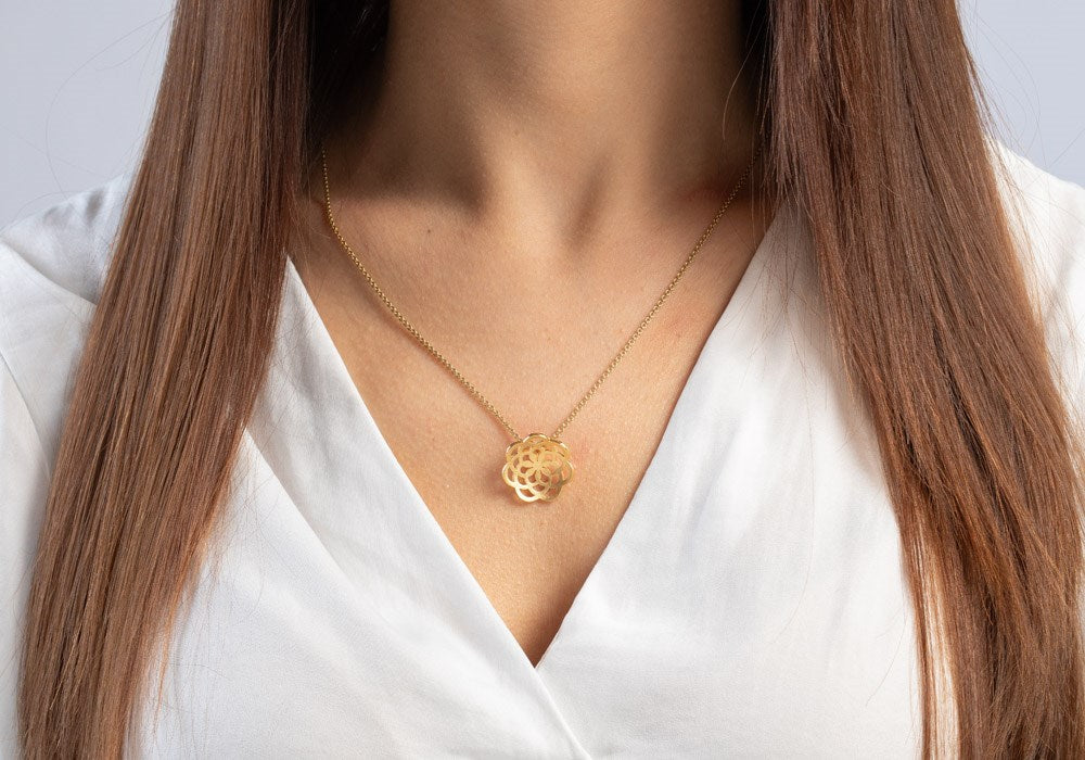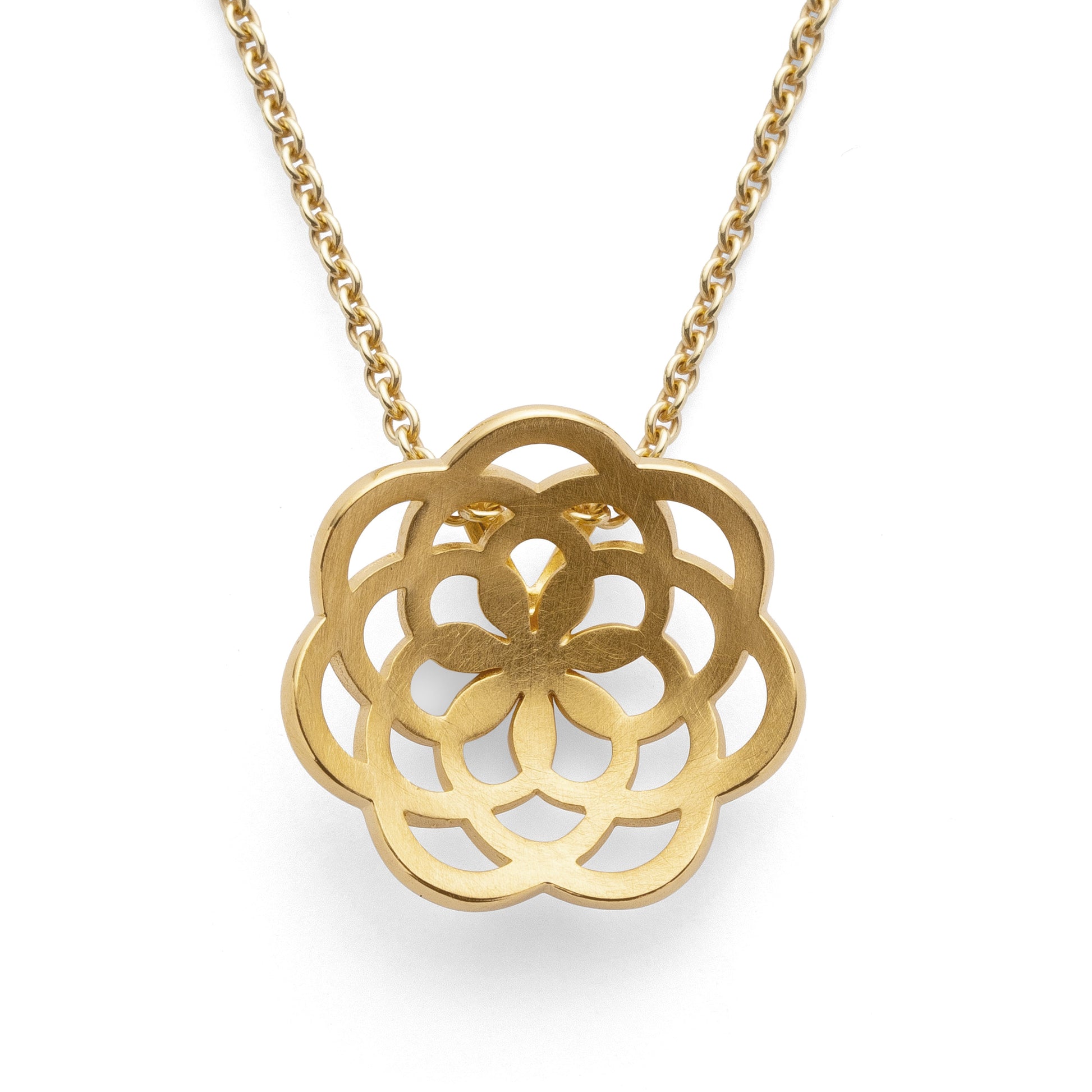 Magisk feminin, blomsterinspireret vedhæng "Lotus" lavet af forgyldt 925/- sterling sølv. Dette smykke er designet af designeren Nadine Resch med stor sans for detaljer. Designersmykkets usynlige ophæng sikrer dets særligt elegante udseende. Fås med matchende øreringe.