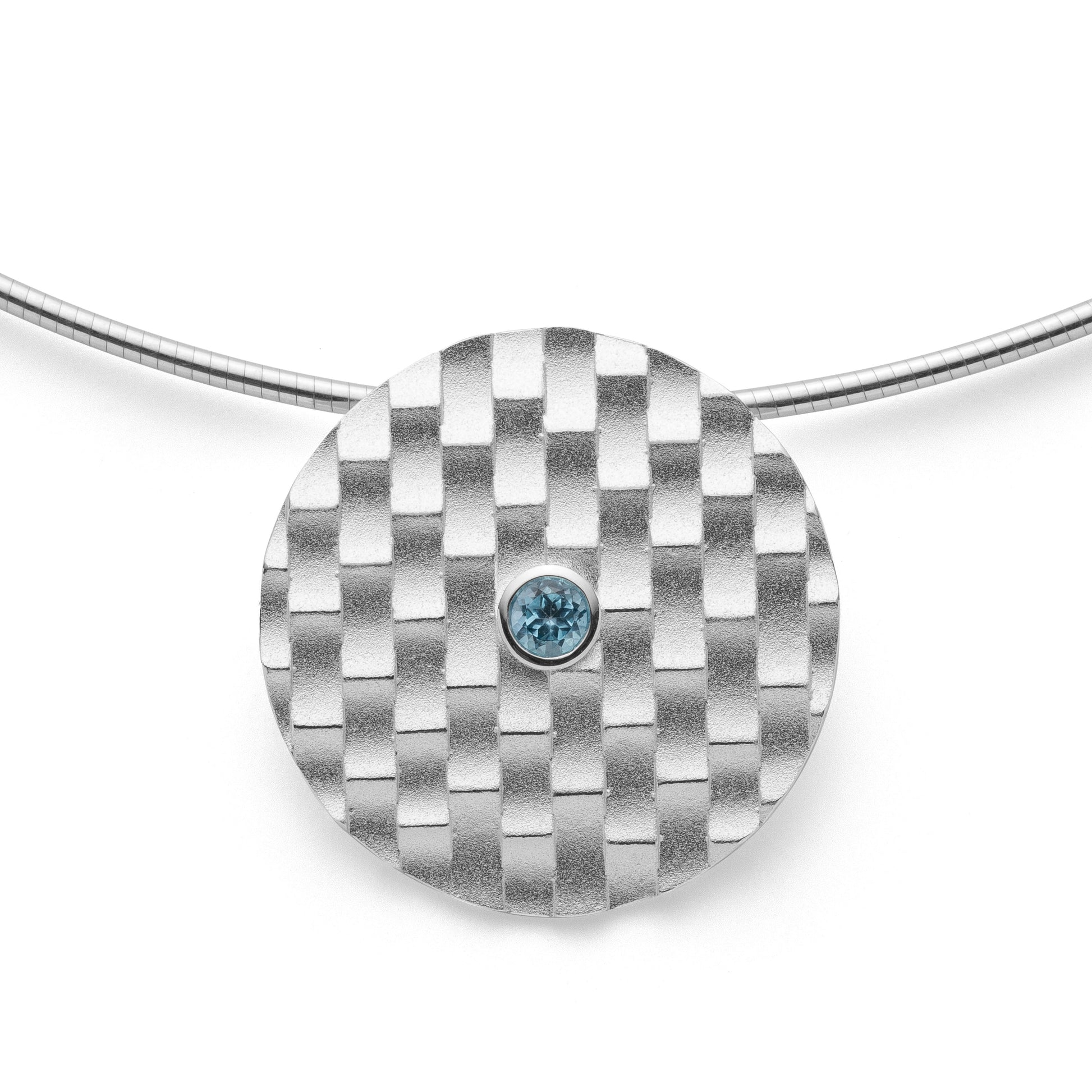 En gennemgående karakteristisk overfladestruktur møder en funklende og centralt placeret blå topas med 0,22 ct i et rundt normalt snit og en diameter på 3,5 mm. Dette imponerende stykke designersmykke er designet af guldsmedmester Thomas Mayer. Vi anbefaler denne unikke halskæde som et sæt i kombination med de tilsvarende ørestikker.