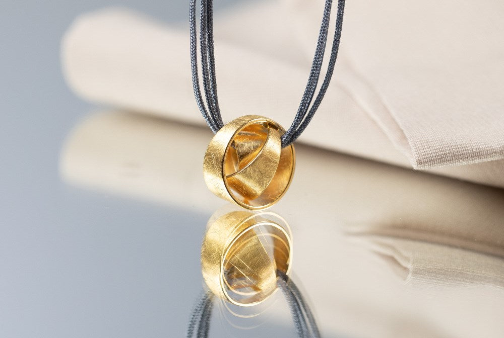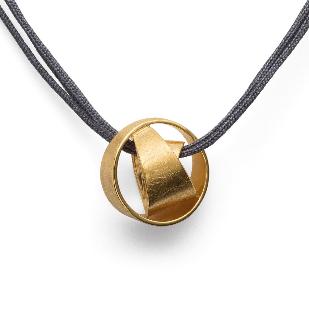 En virkelig velafrundet ting: Matt og ridsemat forgyldt 925 sterling sølv vinder sig til et designstærkt knudevedhæng, kærligt designet af den freelance tyske designer Nadine Resch. Det værdifulde, solide håndværk, der kan ses her løber også denne specielle designlinje af bastian inverun som en rød tråd igennem. Fås med matchende knude øreringe.