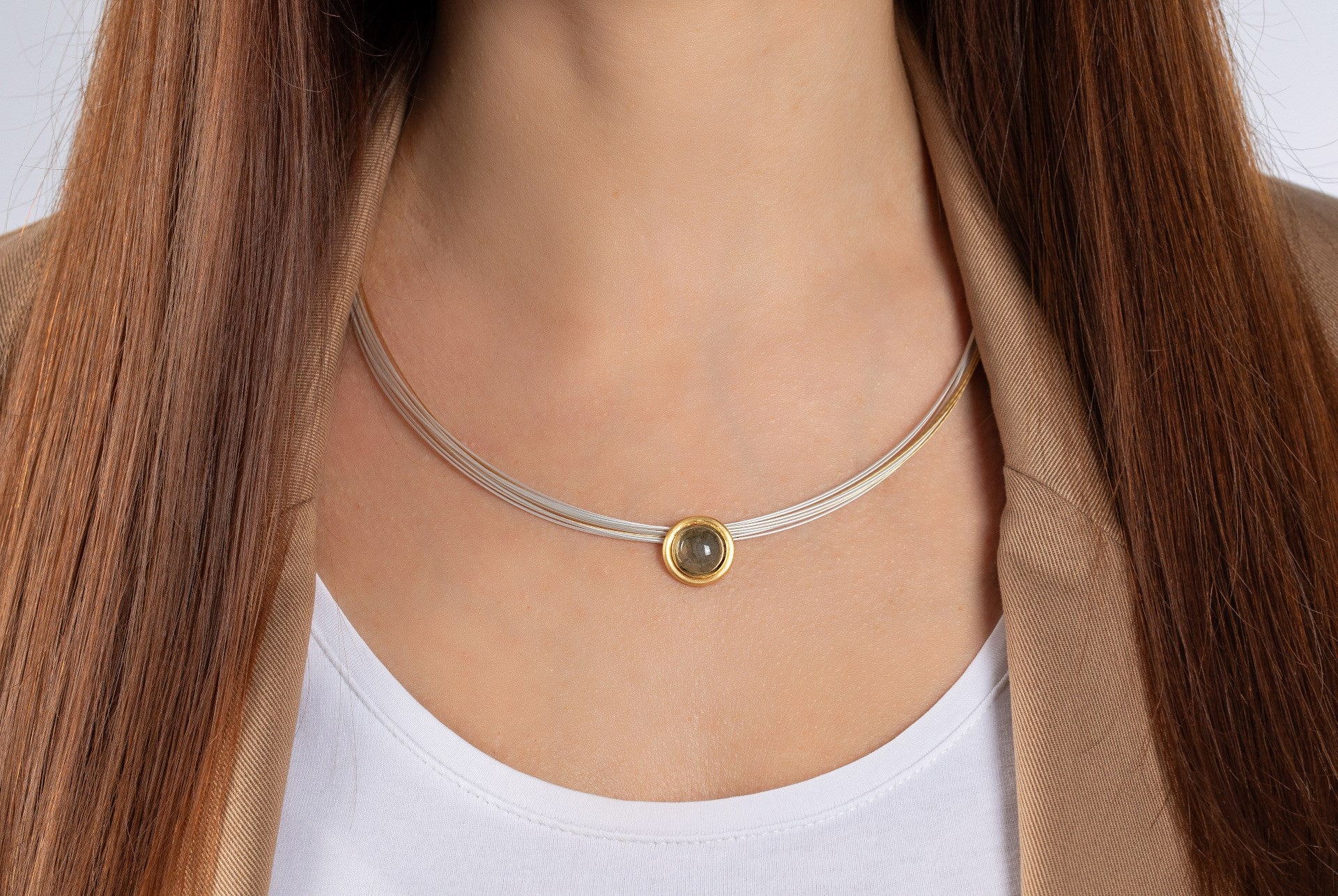 18 karat gul forgyldt, mat og poleret 925/- sterling sølv møder en magisk iriserende labradorit med 2,63 karat. Et designersmykke af høj kvalitet med en unik karakter, der er lavet til at holde. Perfekt i kombination med de matchende ørestikker og den matchende ring.