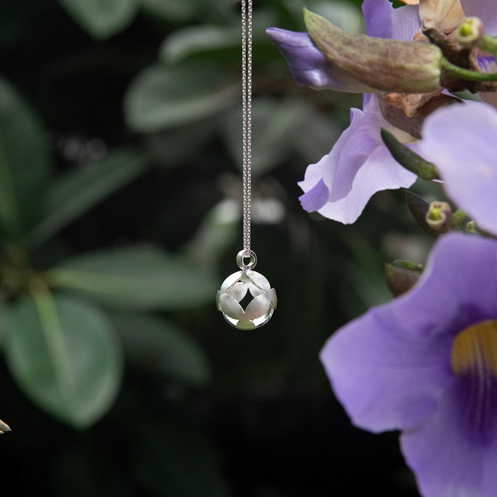 Ein floral inspirierter Designanhänger aus 925/- Sterlingsilber besticht durch eine von Hand bearbeitete mattierte und an den Kanten polierte Oberflächenstruktur. Die raffinierte und zugleich runde Formgebung sorgt für eine einzigartige Ausstrahlung des einzigartigen Anhängers. Durch die einseitig mattierte und einseitig polierte Öse lässt sich das Schmuckstück individuell tragen. Perfekt in Kombination mit den passenden Ohrhängern.