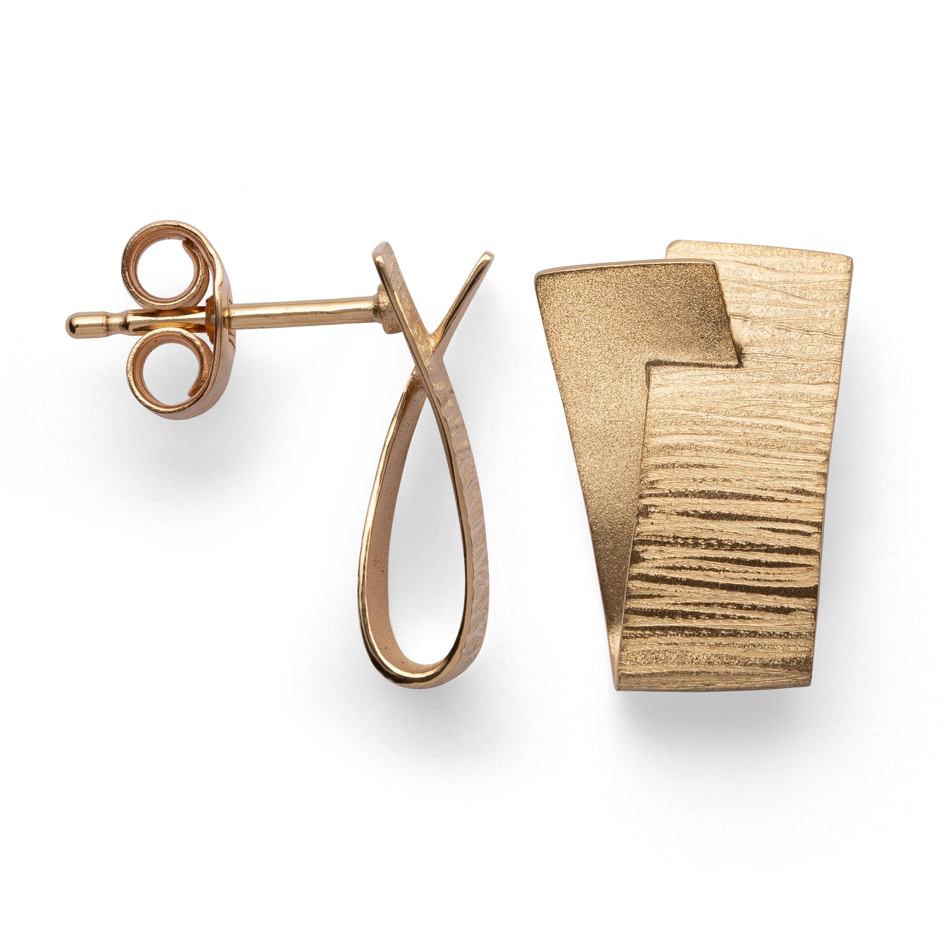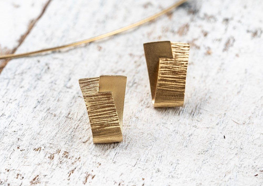 Strongly designed stud earrings made of 750 yellow gold. The unique folded look and the distinctive surface treatment make these hand-crafted earrings made from exquisite materials an effective eye-catcher that you will enjoy for a lifetime. Available with matching pendant and ring. Available exclusively from specialist retailers.