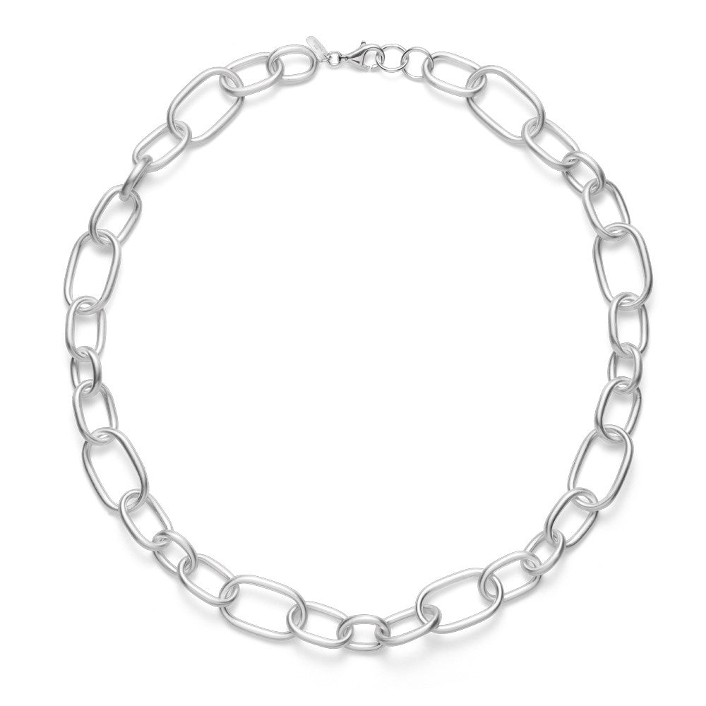 Stylishly interlocking oval jewelry elements made of matt 925/- sterling silver form an irresistible and characterful design necklace. The individual links of different sizes make the necklace an effective eye-catcher and give the piece of jewelry a unique charisma. The length of the necklace is 50 cm in total. Perfect in combination with the matching bracelet.