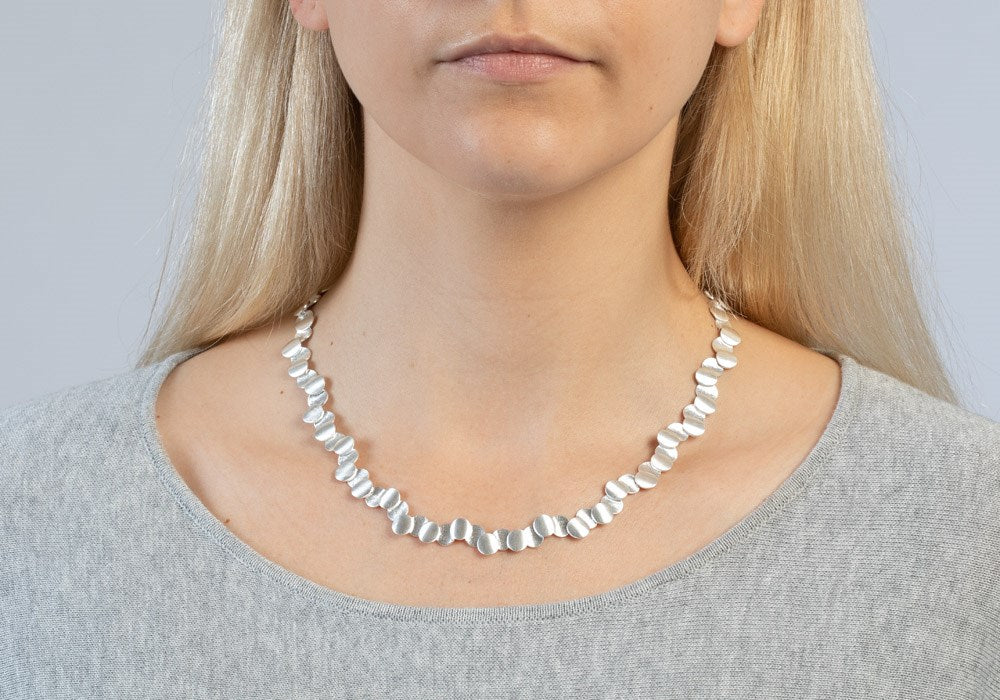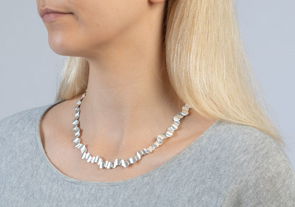 The characterful interplay of matt and scratch-matt, slightly overlapping decorative elements in a geometrically inspired design makes this filigree design necklace made of radiant 925/- sterling silver from the pen of Düsseldorf-based designer Nadine Resch an absolute eye-catcher with the stuff your favorite piece of jewelry. The length adjustment (+3cm) of the otherwise 45cm long necklace ensures a wide range of possible uses and a particularly high level of comfort.