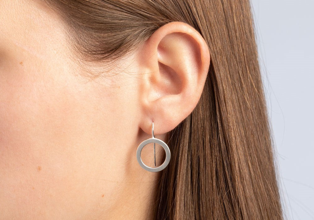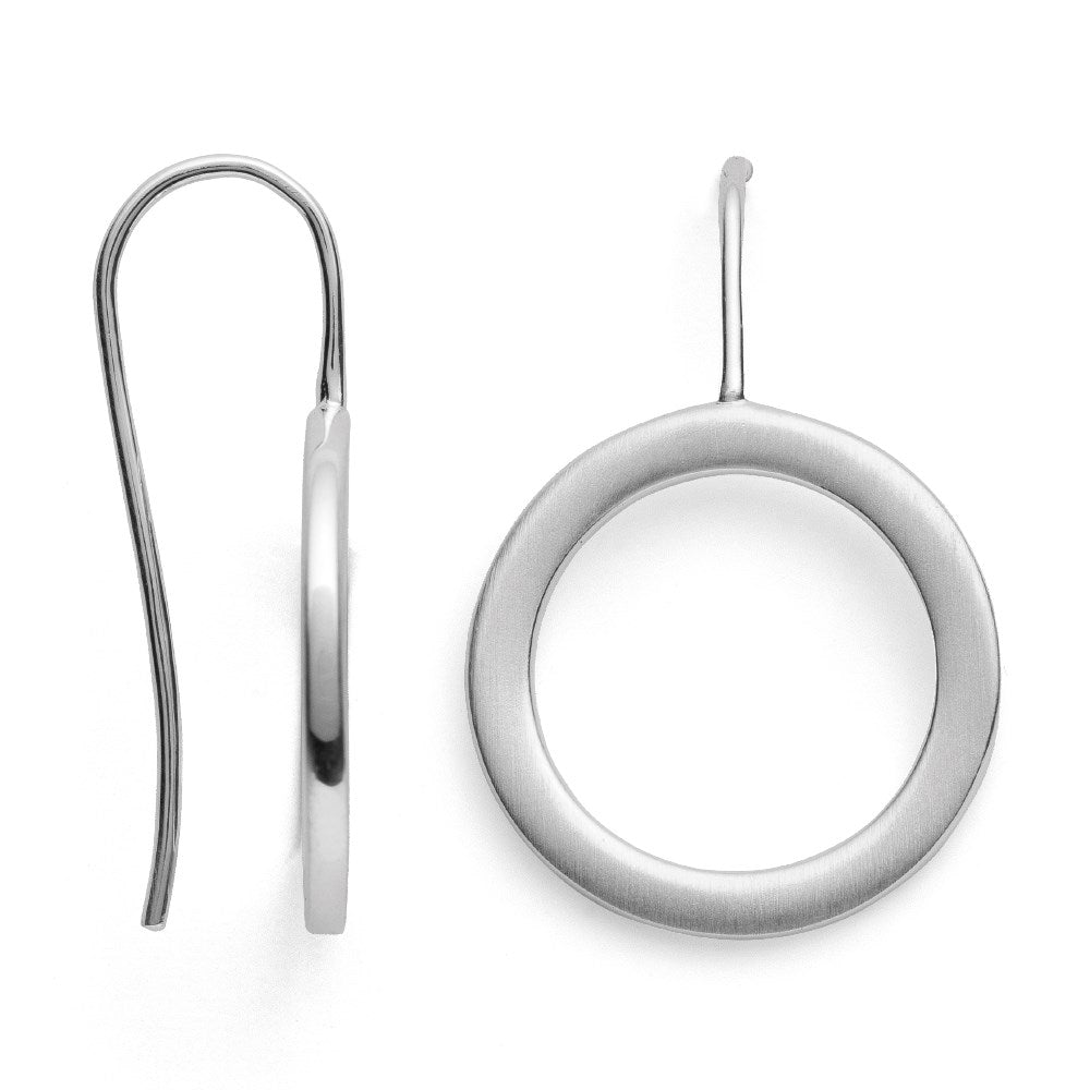 These modern yet timelessly elegant earrings made of matt 925/- sterling silver are circular in shape. Perfect in combination with the matching diamond pendant and matching bracelets from the same design series by designer Antje Liebscher.