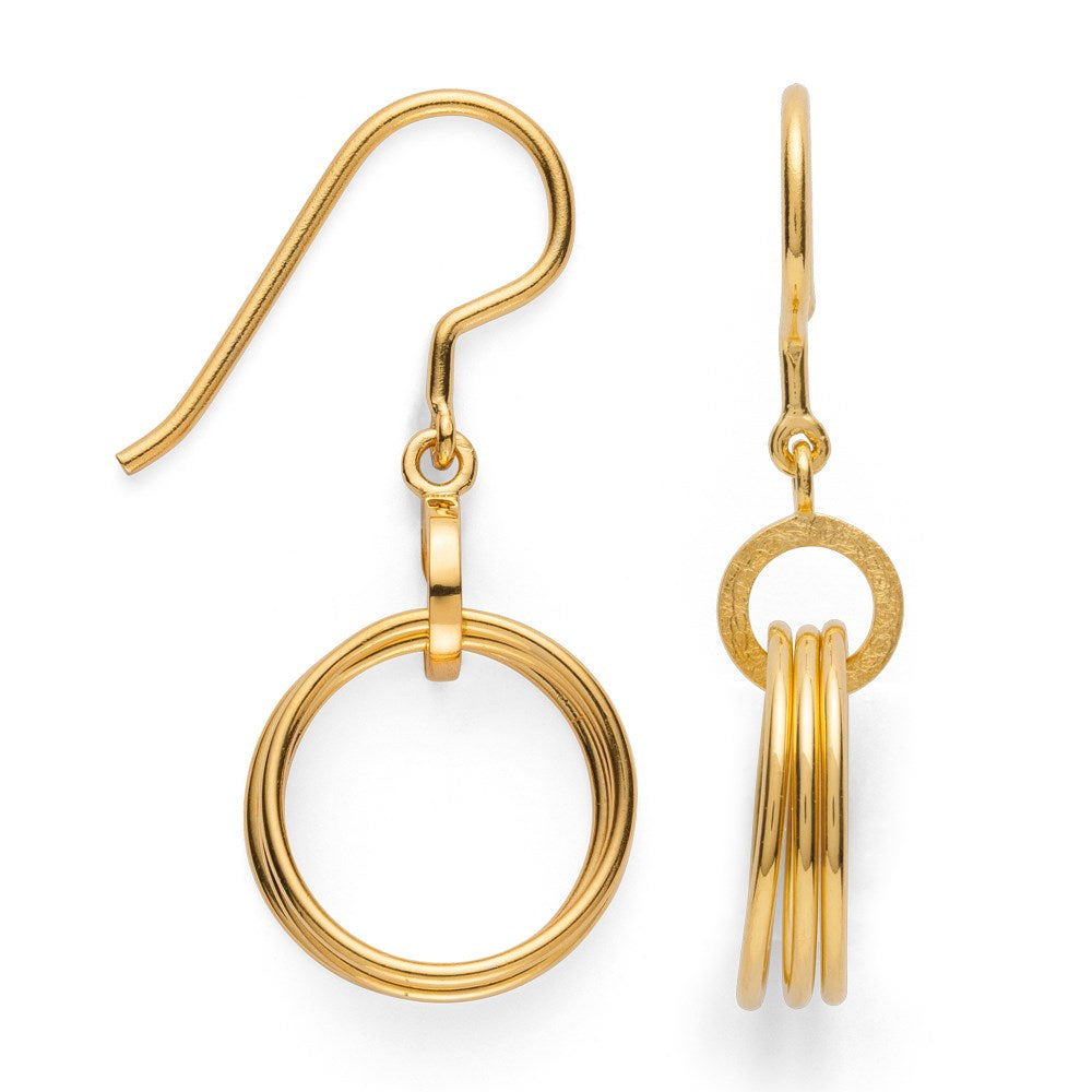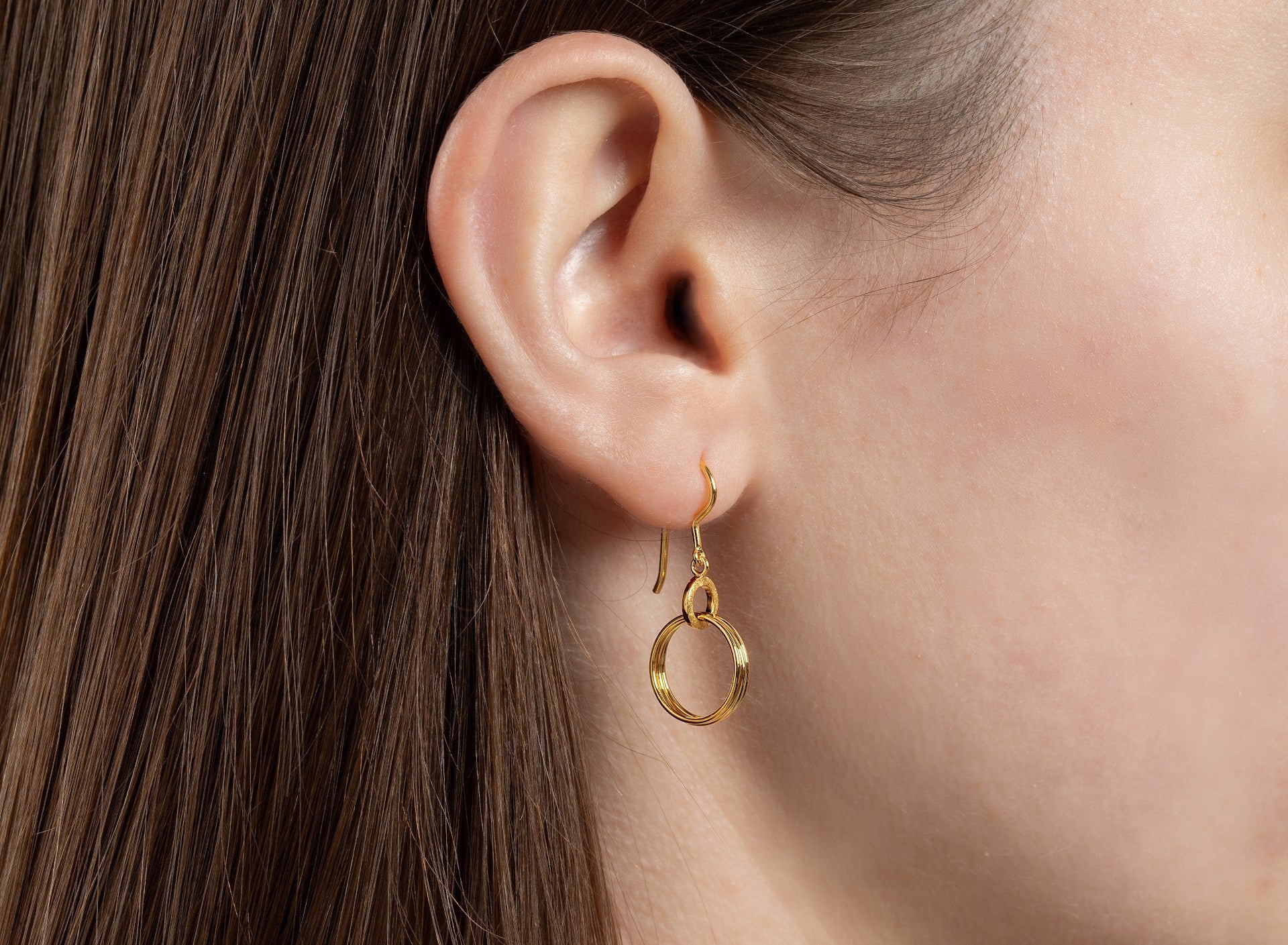An airy, light jewelry design made of gold-plated 925 sterling silver impresses with four interconnected, circular jewelry elements. The modern and stylish design earrings designed by designer Antje Liebscher impress with their scratch-matt and polished surface structure. Perfect in combination with the matching pendant.