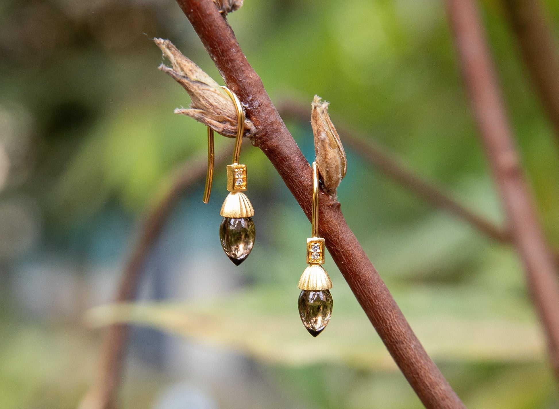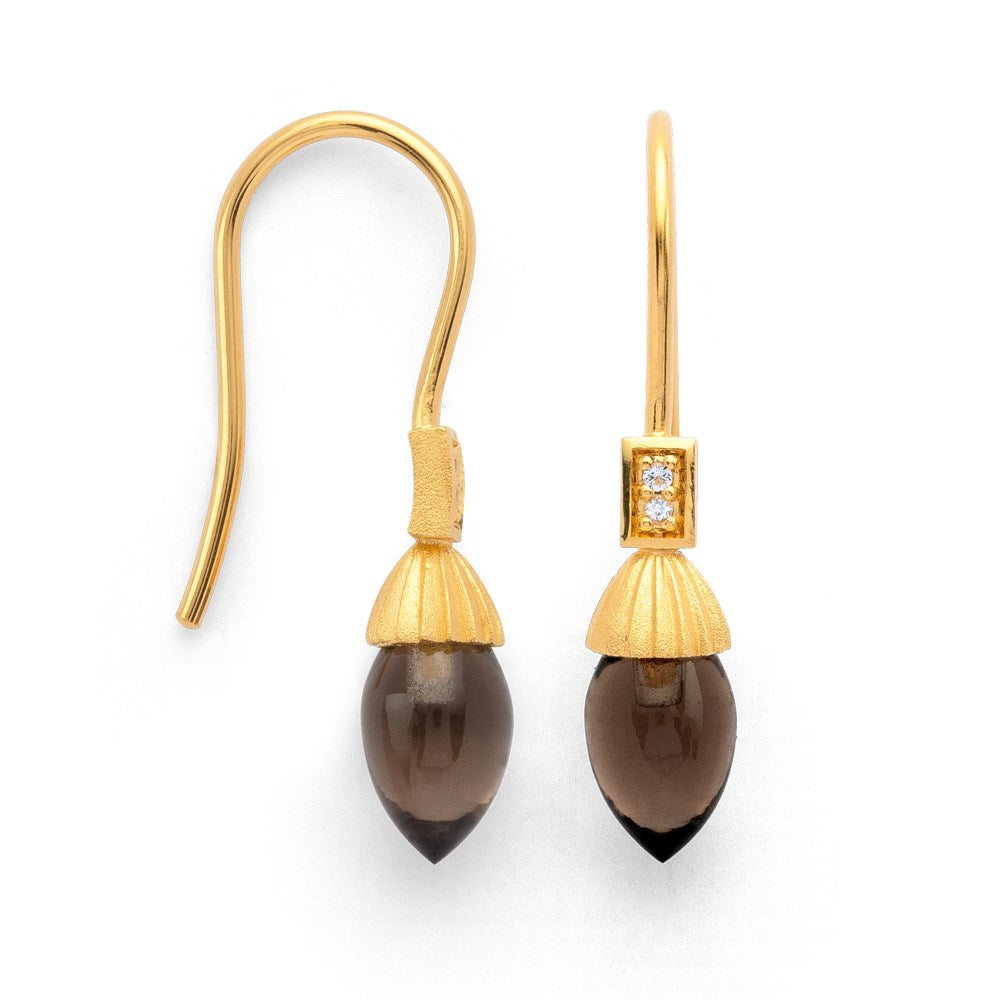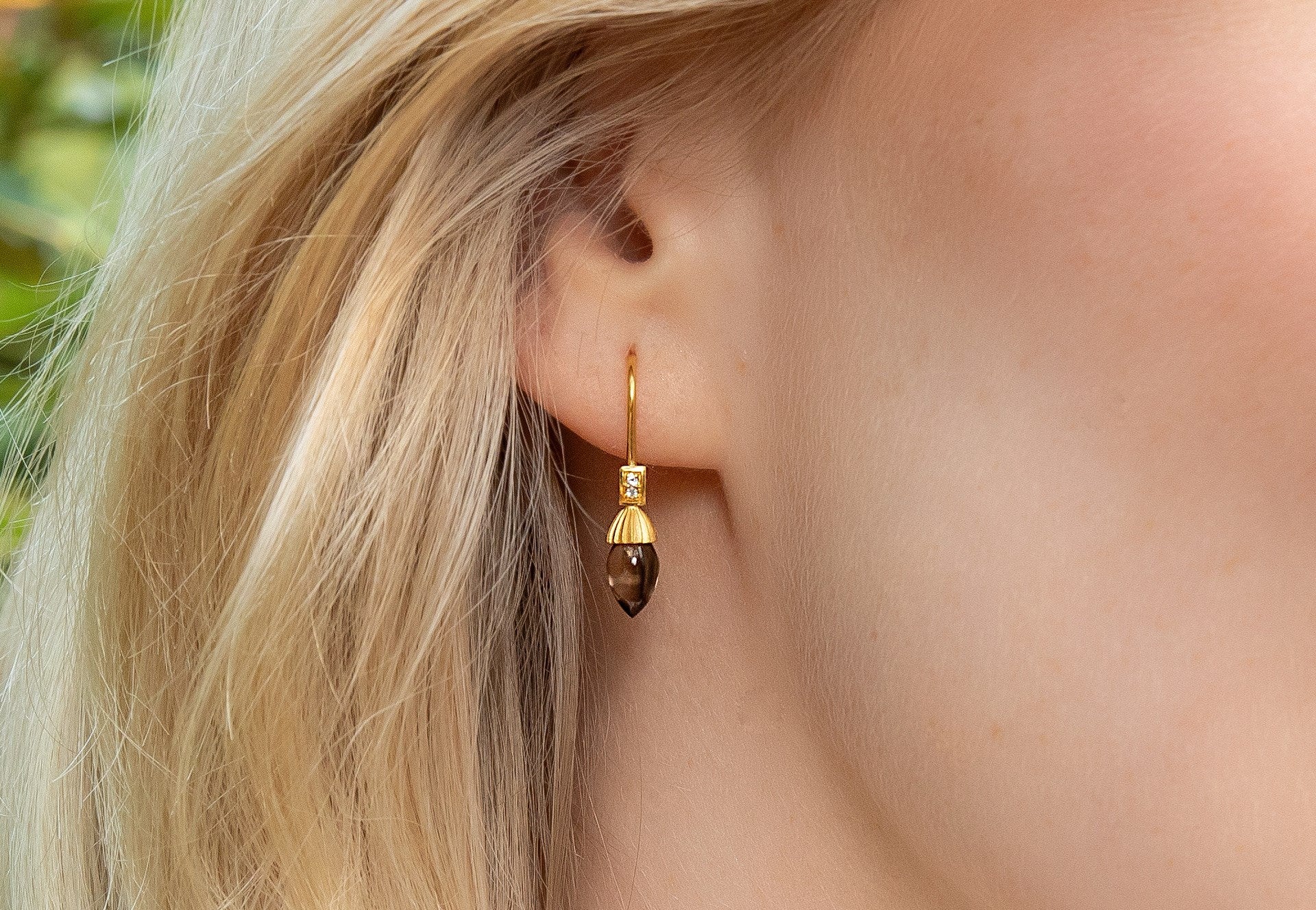 Enchanting earrings made of gold-plated and sand-matt 925 sterling silver meet a teardrop-shaped smoky quartz (0.26 ct in total) and two white topazes with a total of 0.02 ct. The characteristic shape and the placement of the topazes make these handcrafted earrings an effective eye-catcher. Perfect in combination with the corresponding pendant.