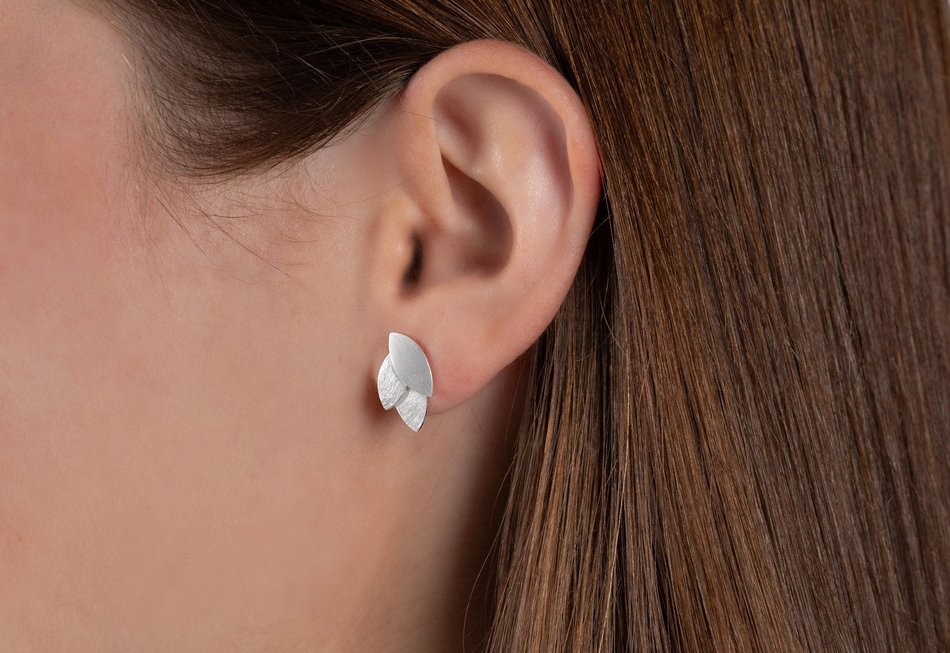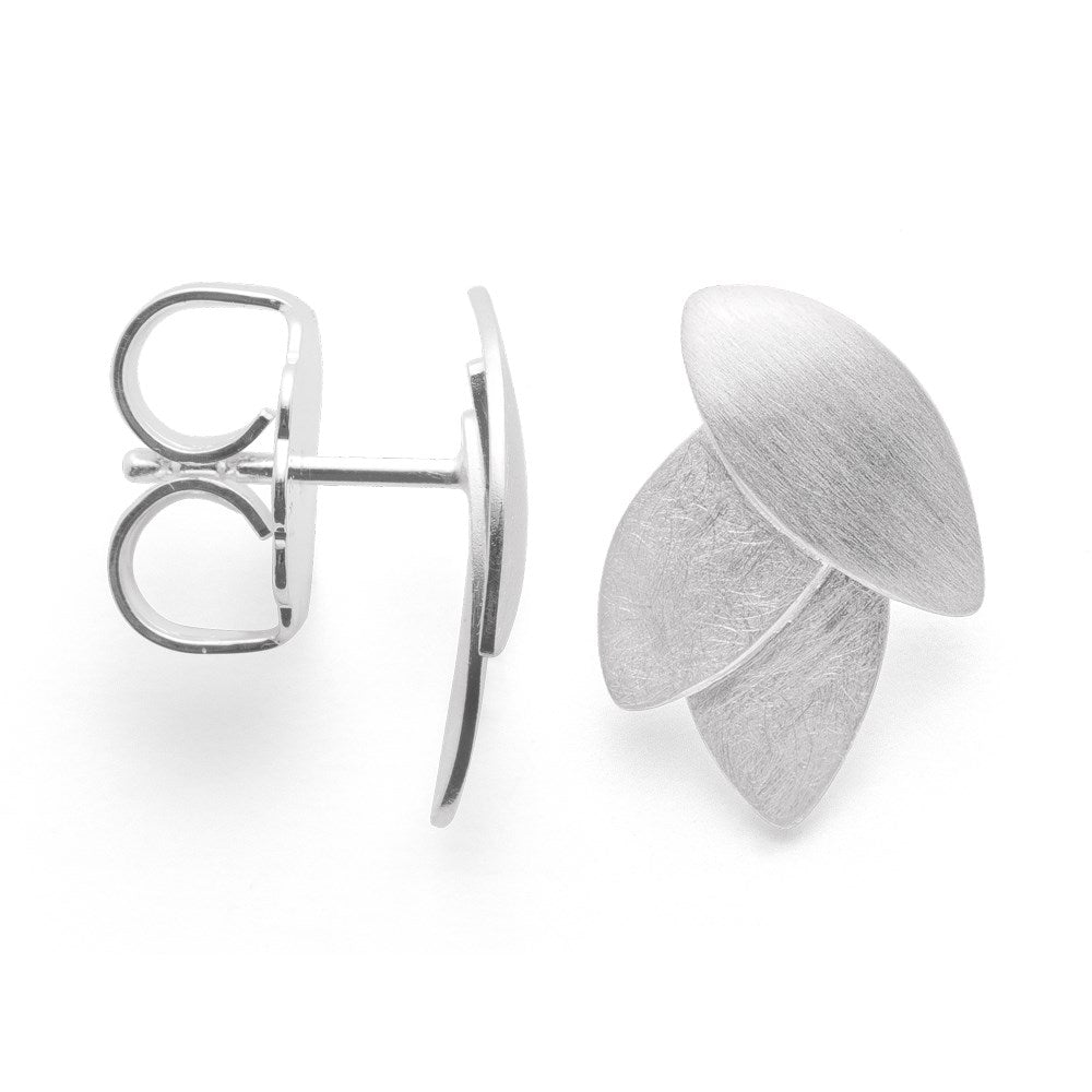 "Leaf by Leaf Collection" - enchanting stud earrings made of 925 sterling silver meet a floral-inspired design language. The combination of matt and scratch-matt surface treatment ensures a particularly characteristic and unique appearance of the handcrafted designer jewelry. True jewelry all-rounders for many outfits. This ear jewelry comes with a large ear nut. Available with matching ring, pendant and bangle.