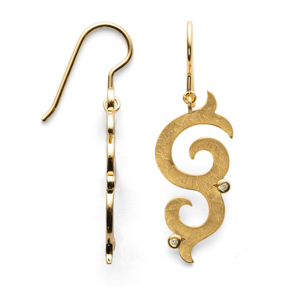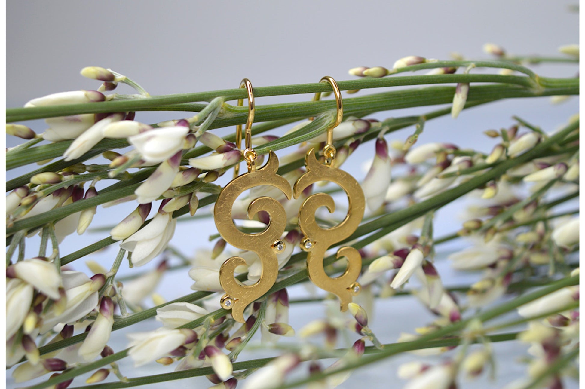 Sensual and feminine-looking earrings made of yellow gold-plated 925/- sterling silver with a scratch-matt surface and polished temples as well as polished edges. A total of 4 sparkling diamonds (W-SI) each weighing 0.005ct (0.02ct in total) adorn this wonderful piece of designer jewelry designed by Düsseldorf jewelry designer Nadine Resch. Available with a matching pendant and can be combined wonderfully.