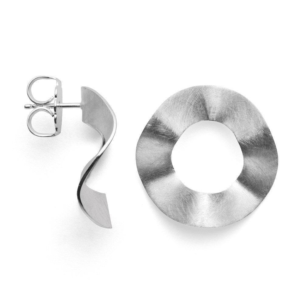 Modern and yet timelessly elegant: circular maxi stud earrings "Wavy Statement" made of scratch-matted 925/- sterling silver in a wavy design. Perfect in combination with the corresponding statement pendants from the same design series by Düsseldorf designer Nadine Resch. To ensure a comfortable fit on the ear, these ear studs are supplied with a large ear nut.