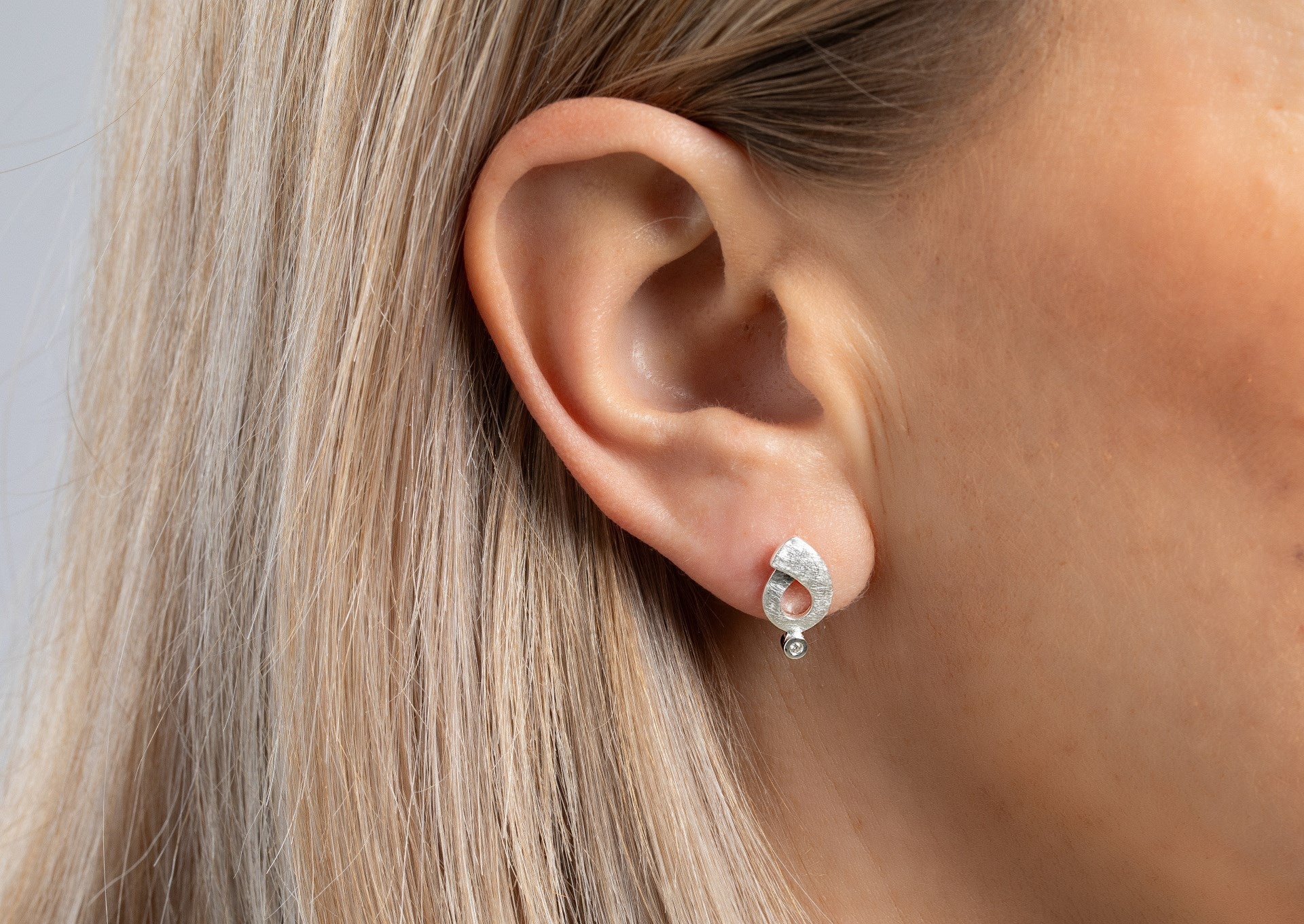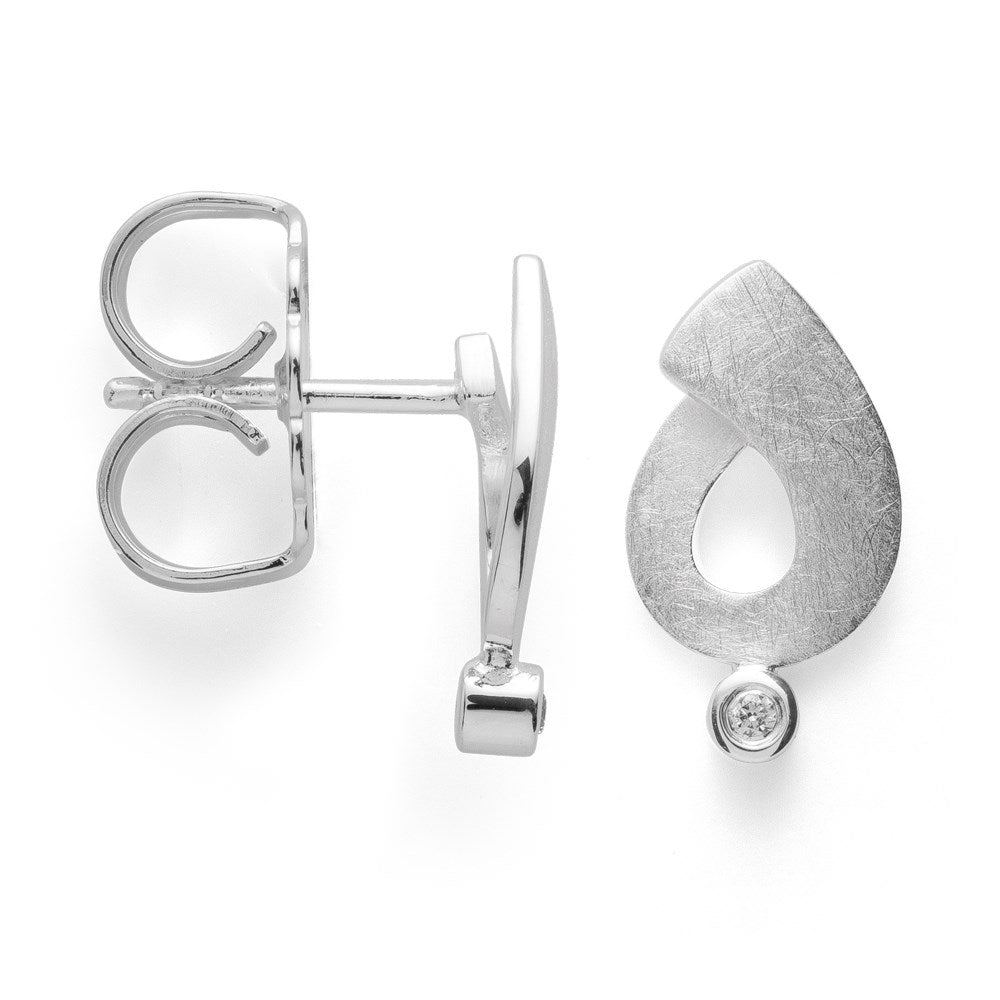 Sensual and slightly twisted ear studs made of scratch-matted 925/- sterling silver: These magical earrings designed by Düsseldorf designer Nadine Resch impress with sparkling diamonds (0.02ct W-SI in total) and a dynamic shape. A valuable piece of jewelry with the makings of an absolute favorite piece of jewelry. Available with matching pendant and ring.
