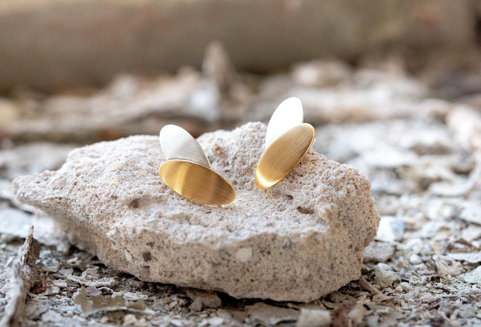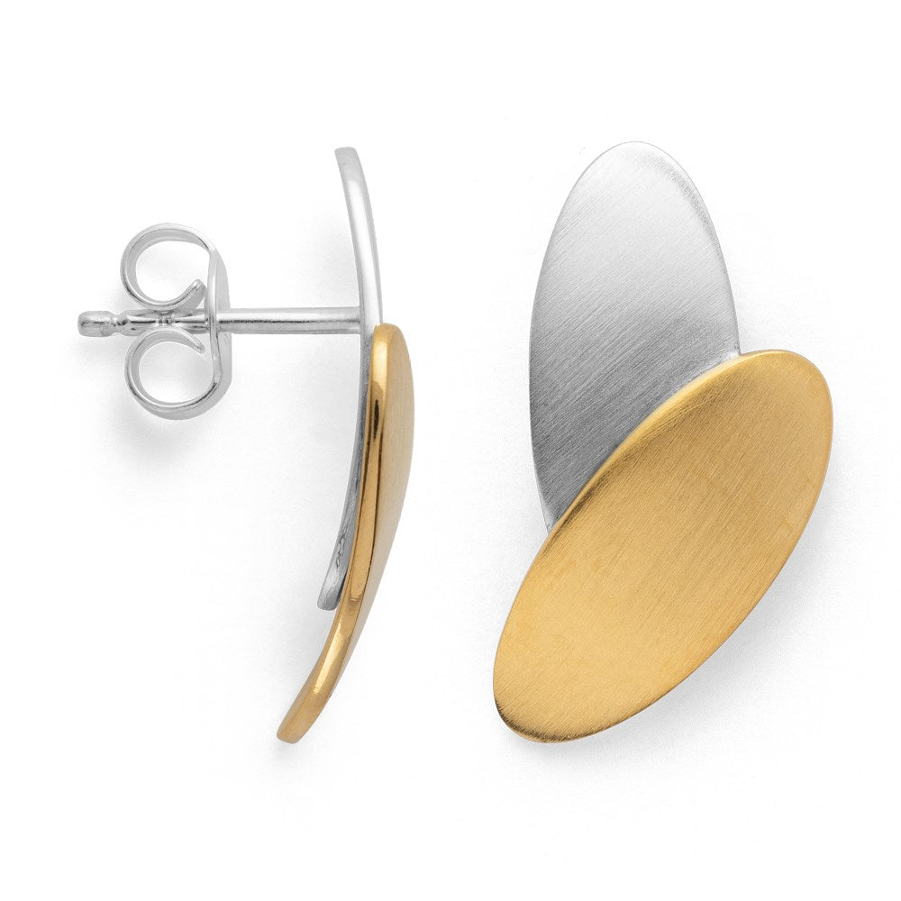 Floral-inspired stud earrings made of matt 925/- sterling silver meet a partially gold-plated surface finish. The hinted yet subtle leaf look of the handcrafted pieces of jewelry ensures an elegant appearance. An attractive design from the Düsseldorf designer Nadine Resch. Together with the matching ring and pendant, the stud earrings can be combined in a variety of ways.