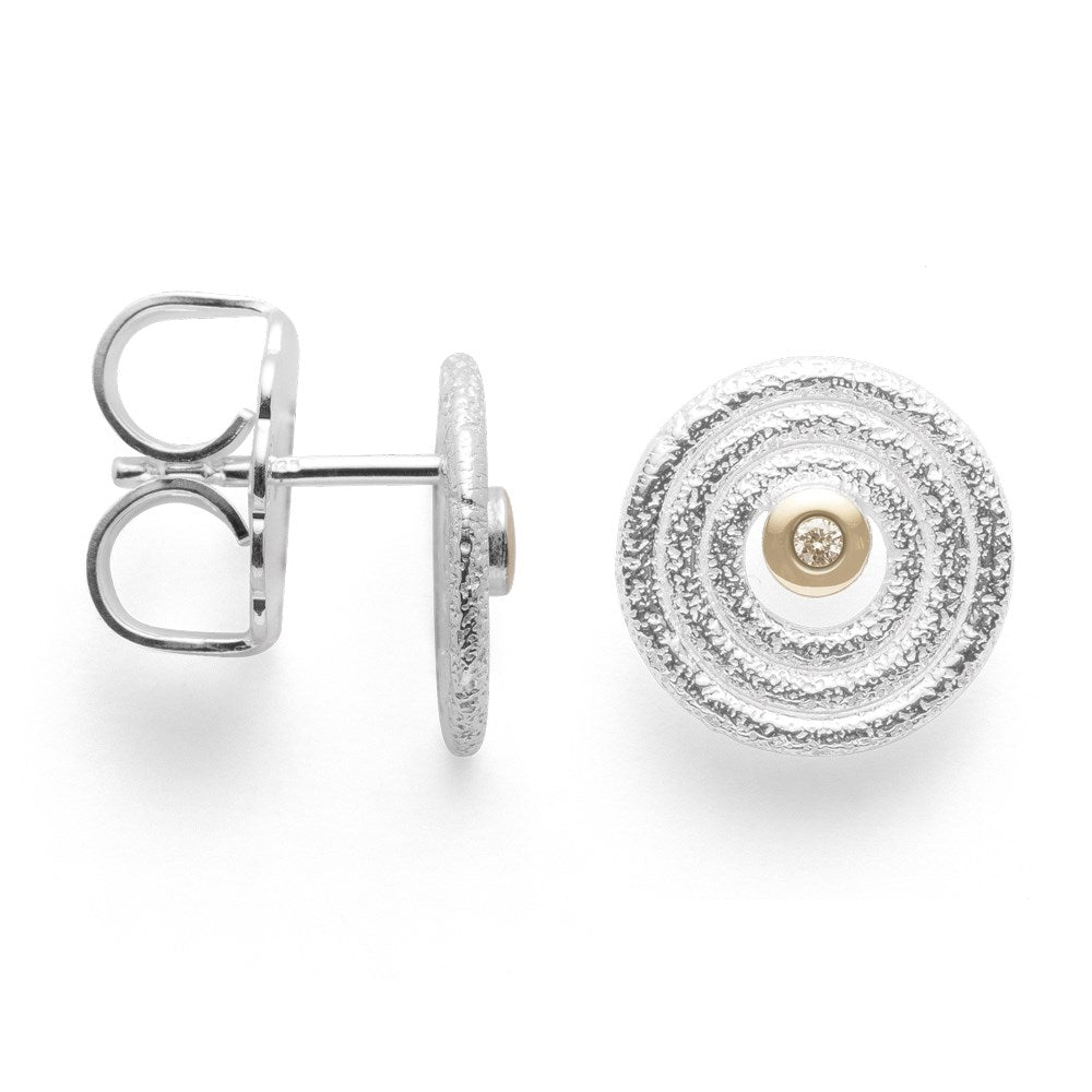 Enchanting design stud earrings made of 925/- sterling silver with an attractive ring look meet a matt and brushed surface structure. The sparkling diamonds (0.02ct in total), framed by a gold-soldered* (14K) setting, make the stud earrings special and modern jewelry statements. These designer earrings were created with great attention to detail by master goldsmith Thomas Mayer. Perfectly available in combination with the matching pendant and ring.