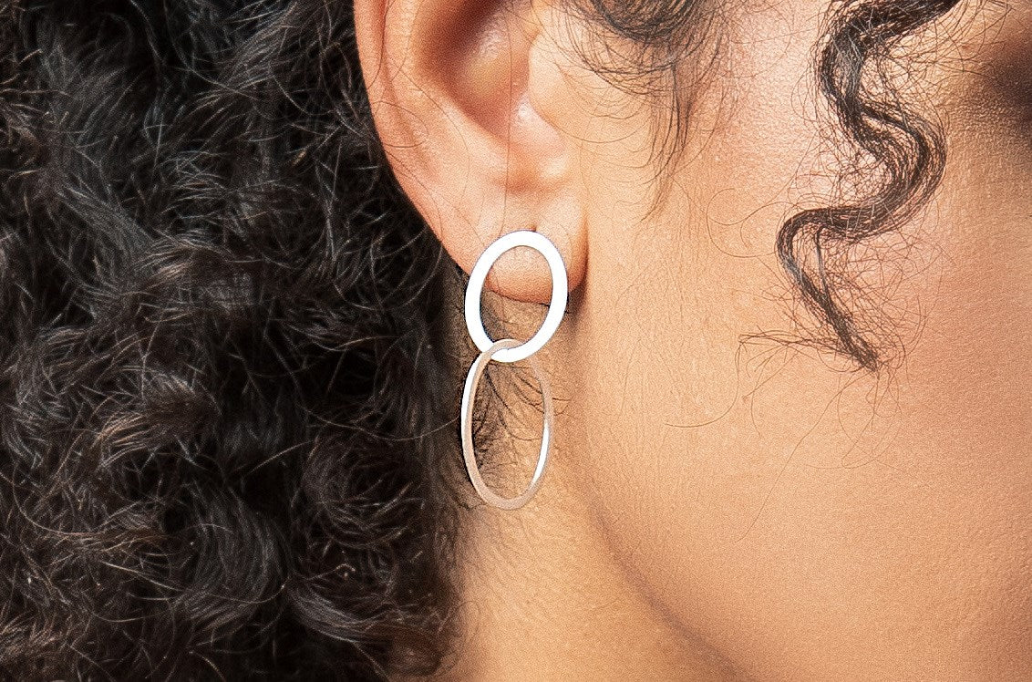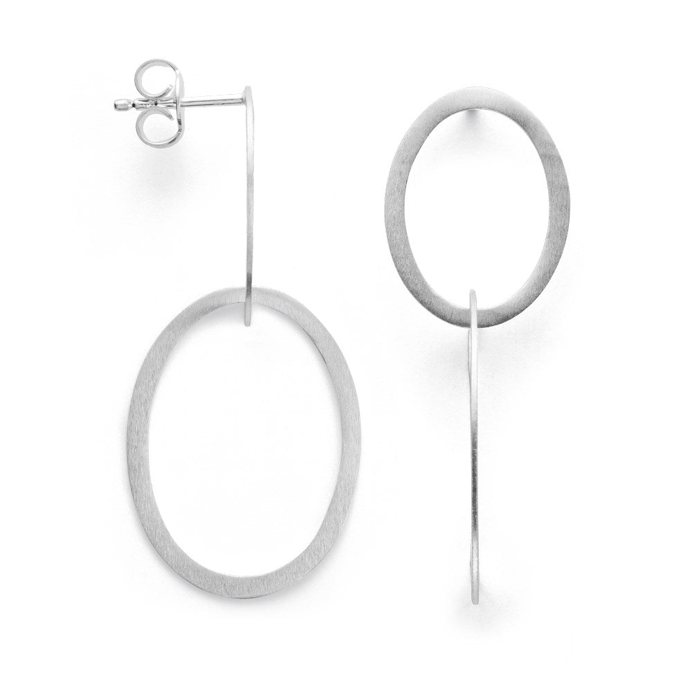 Airy, light earrings designed by designer Antje Liebscher. Two delicate, circular jewelry elements made of 925/- sterling silver with a matt surface are joined together to form these modern, flexible swinging earrings, which are perfectly accentuated with the matching necklace. Suitable for every outfit and every occasion. Also available in a gold-plated version.