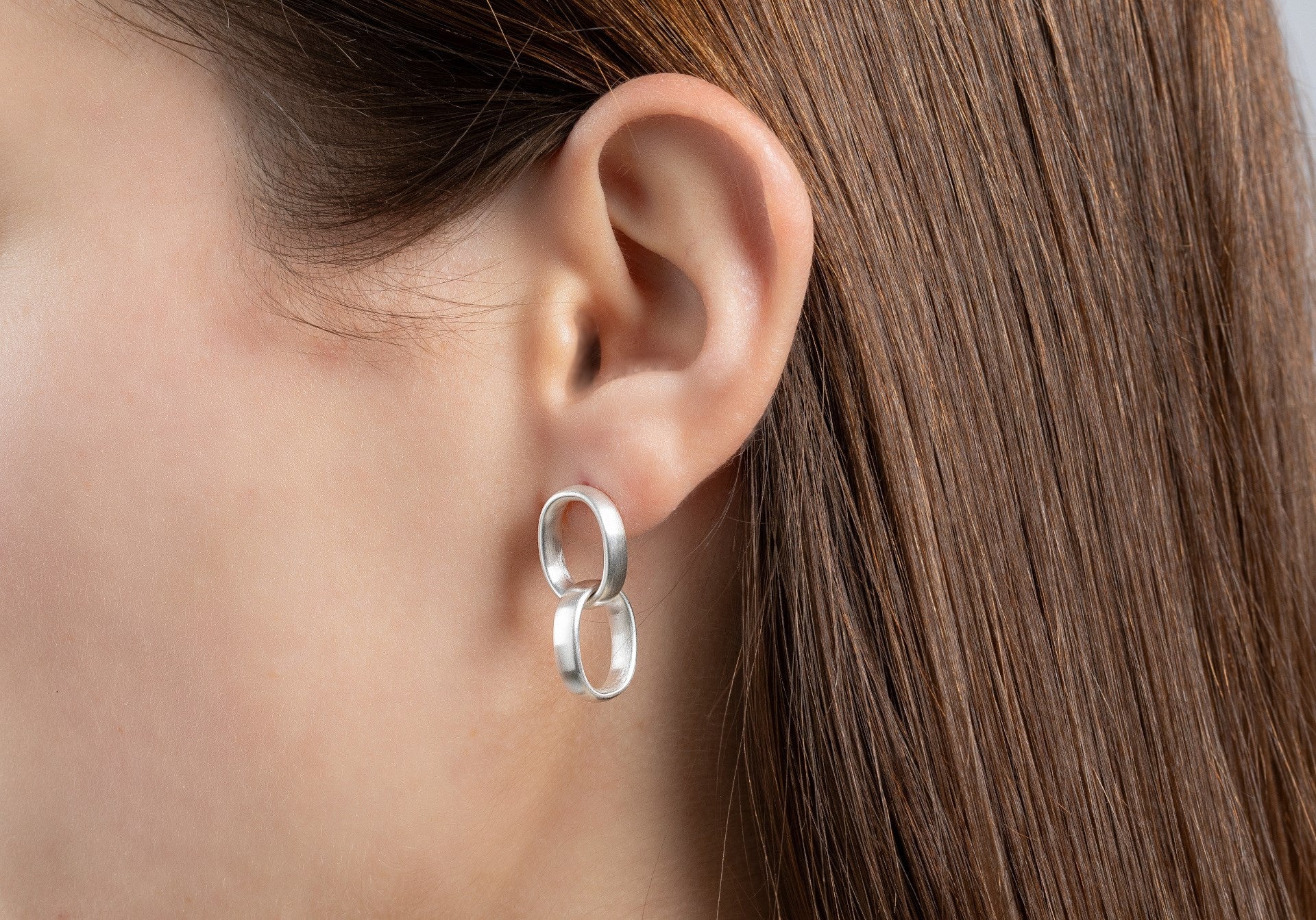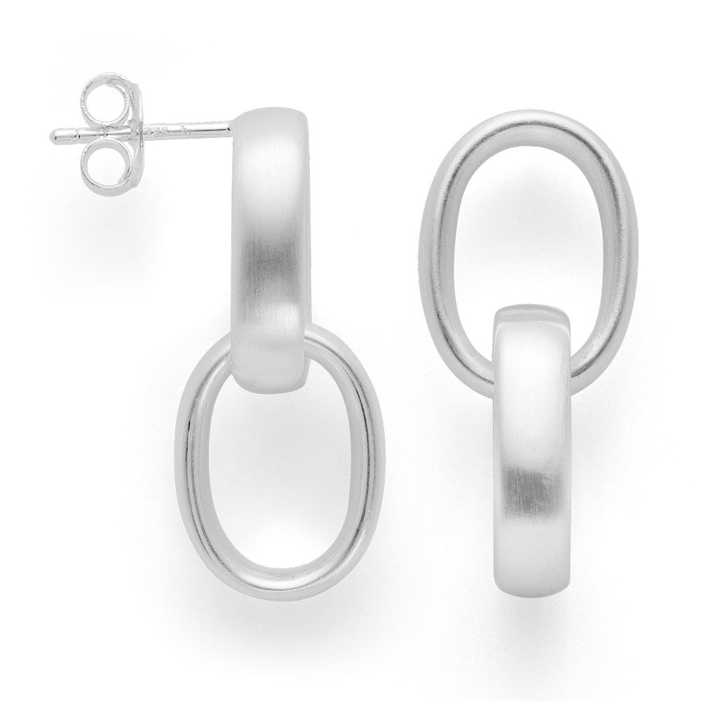 Modern and stylish at the same time - these stud earrings from the 'Chunky Love' Collection made of matt 925/- sterling silver impress with two interlocking, equally sized jewelry elements. The dynamic play of the lower decorative element, which moves slightly back and forth depending on the movement, ensures the special charisma of the purist and at the same time sporty and elegant earrings. Available with matching necklace and bracelets.