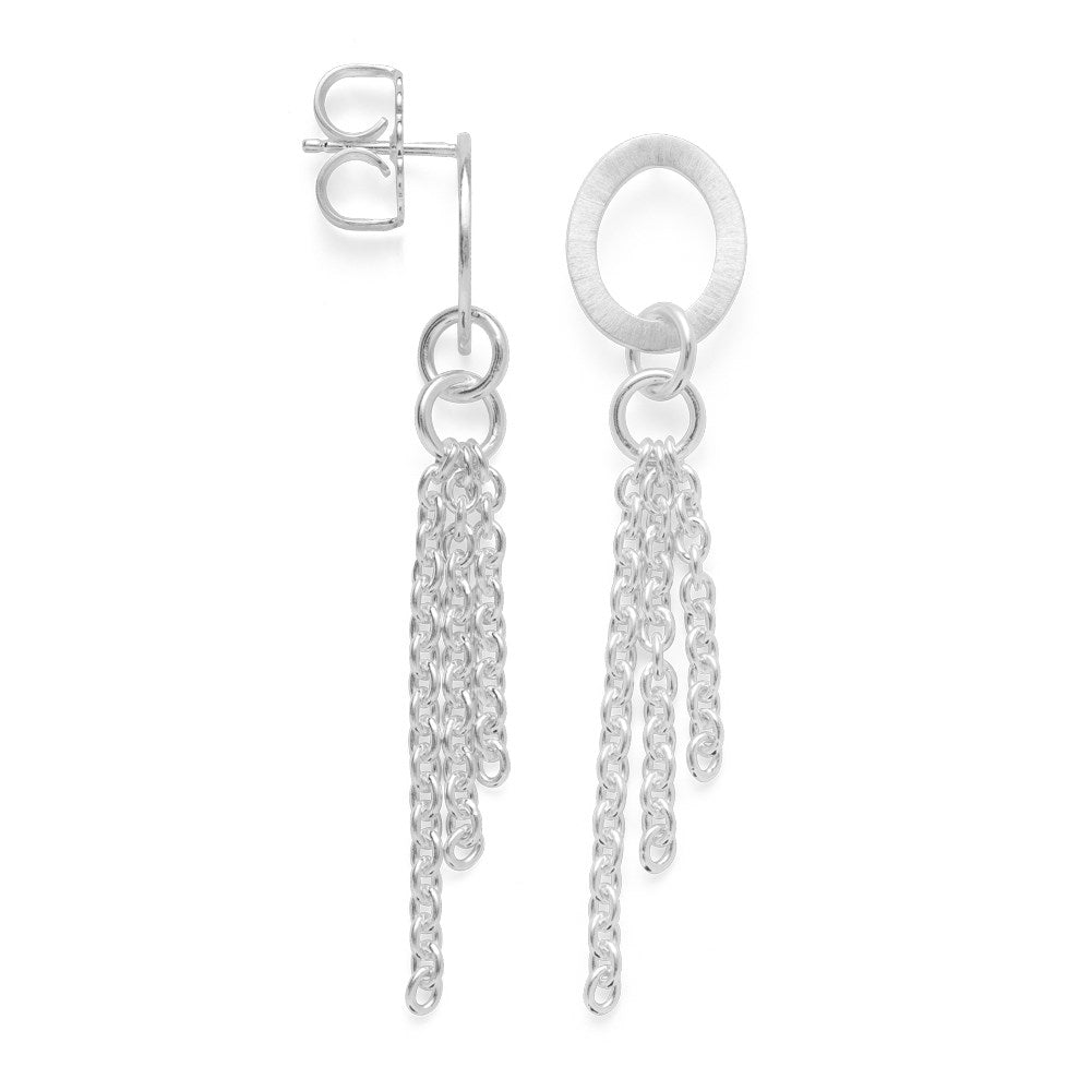 Filigree and at the same time modern design stud earrings made of matt and polished 925/- sterling silver impress with their unique design language. A slightly oval-shaped decorative element meets three round anchor chains of different lengths, which achieve a particularly elegant effect and lightness thanks to their flexible mobility. The unique design earrings were created by the designer Antje Liebscher. Perfect in combination with the matching necklace.