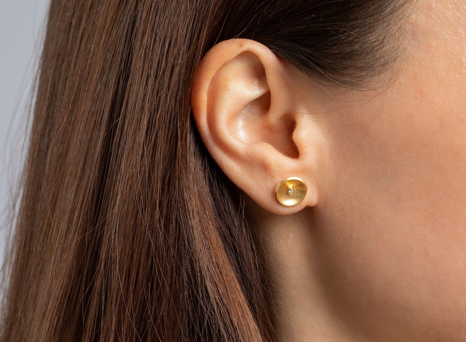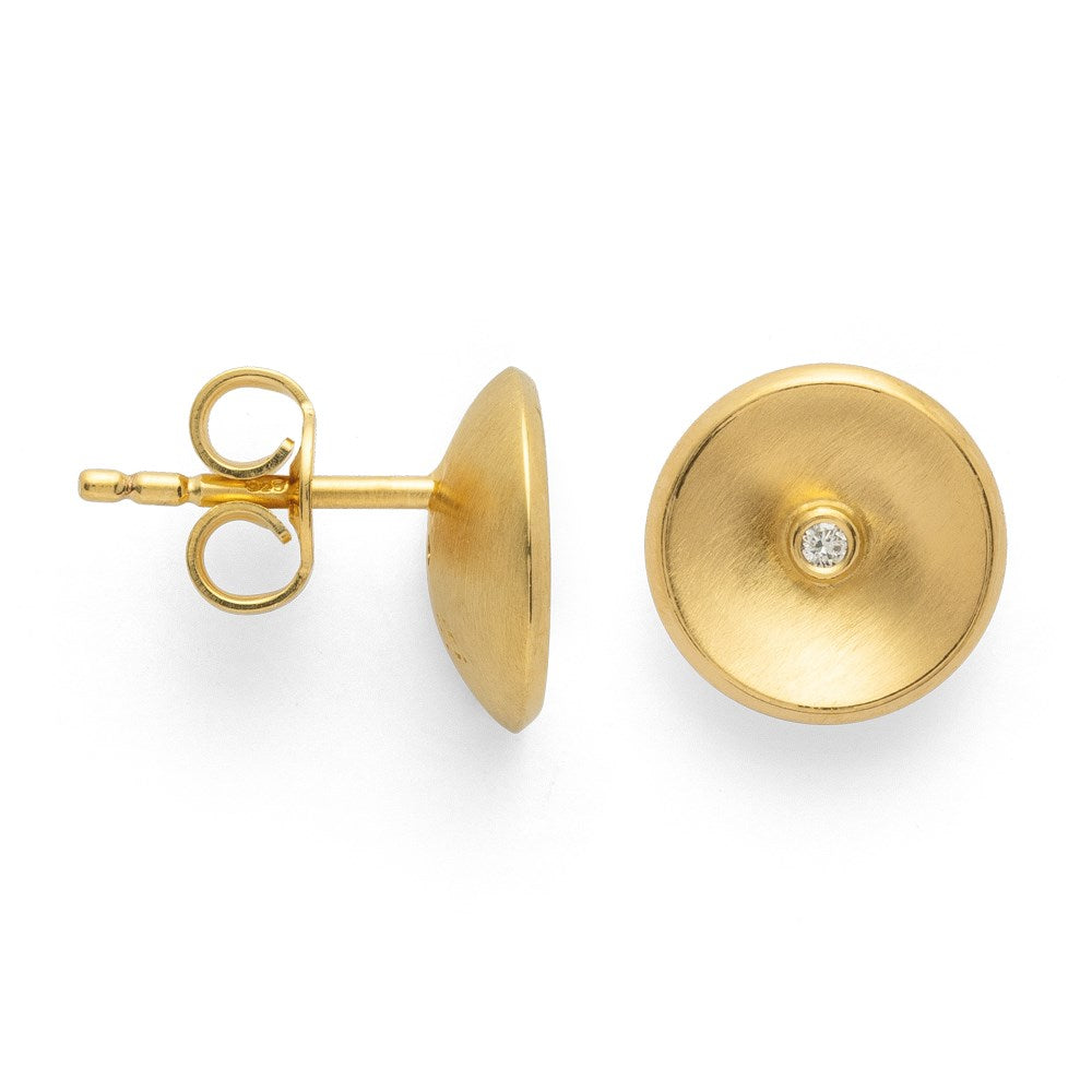Geometrically inspired, these stud earrings made of gold-plated 925/- sterling silver are crowned with brilliant-cut diamonds with a total of 0.02 ct placed in the middle. Created with great attention to detail by designer Nadine Resch. Available with matching pendant and matching ring.