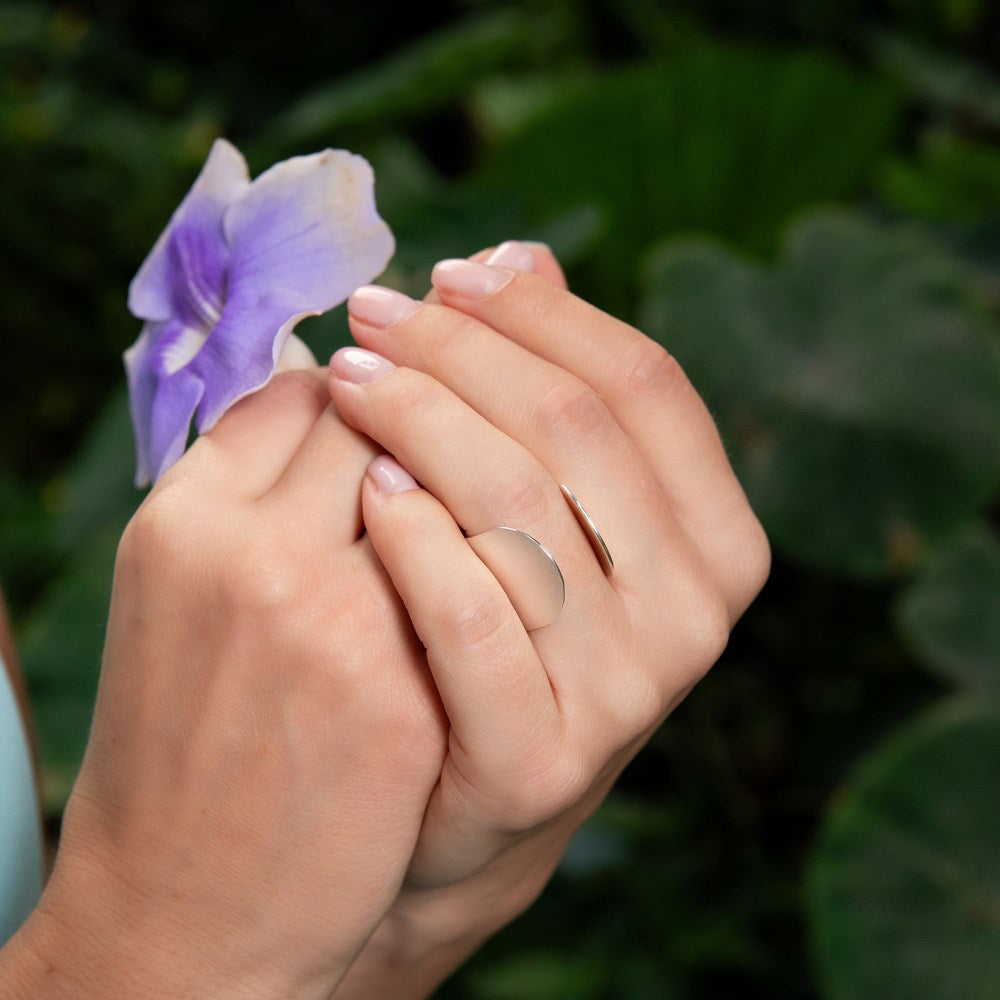 "Moonwalk Collection" - a scratch-matt design ring made of 925 sterling silver impresses with its rounded and stylish shape. The opening at the top gives the piece of jewelry a unique look. A true jewelry statement from the pen of designer Marta Szafraniec, which is a special eye-catcher thanks to the perfect craftsmanship. Perfect in combination with the matching pendant, necklace and the corresponding long or short ear studs.