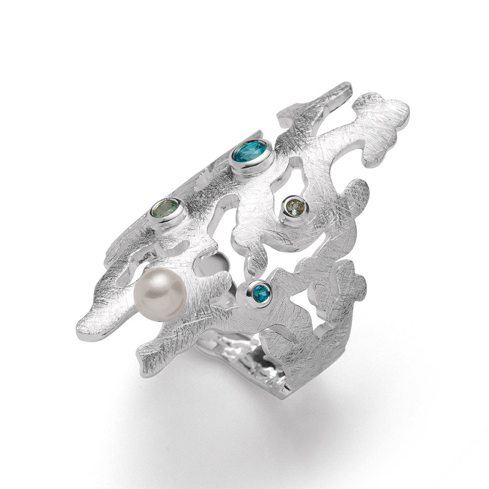 “Into the Blue” – a masterpiece of jewelry art and a tribute to craftsmanship. 4 blue topazes in different color varieties and a white button pearl with a total of 0.82ct adorn the newly released highlight ring by bastian inverun. The highlight series "Into the Blue" made of matted 925/- sterling silver, inspired by the underwater world of the world's oceans and rare corals, illustrates bastian inverun's high standards of quality and workmanship.
