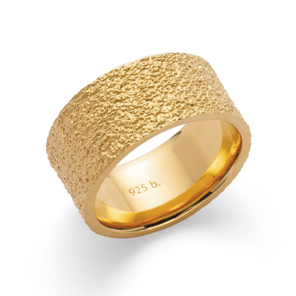 This ring made of gold-plated 925/- sterling silver impresses with a hand-finished matt, brushed surface structure and a strikingly wide ring band. A special piece of jewelry that can be combined in many ways and is very well received thanks to the high-quality workmanship and consistently handcrafted character. Perfect in combination with the matching ear studs and matching pendant and available in pure silver.