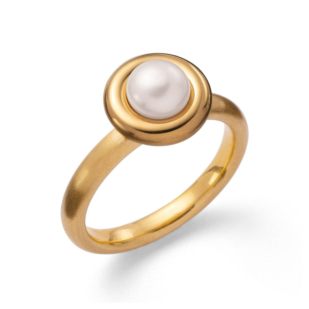 This elegant, gold-plated ring made of matt and polished 925/- sterling silver perfectly expresses the white cultured pearl (1.53ct) as a symbol of timeless beauty. A simple yet elegant jewelry design by designer Nadine Resch. Also available in combination with the matching ear studs, the matching pendant and the matching bracelet.