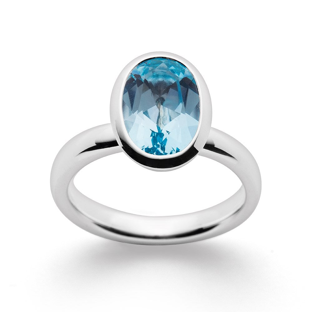 Modern and timeless at the same time: This characteristic ring made of polished 925 sterling silver impresses with its high-quality workmanship and an exciting faceted, oval blue topaz (color "Sky Blue") with a total of 3.78ct in normal cut. Available with matching pendant and matching ear studs.