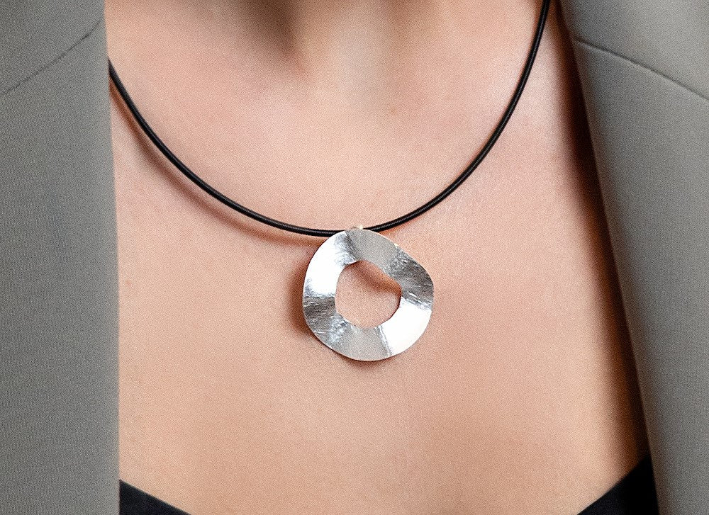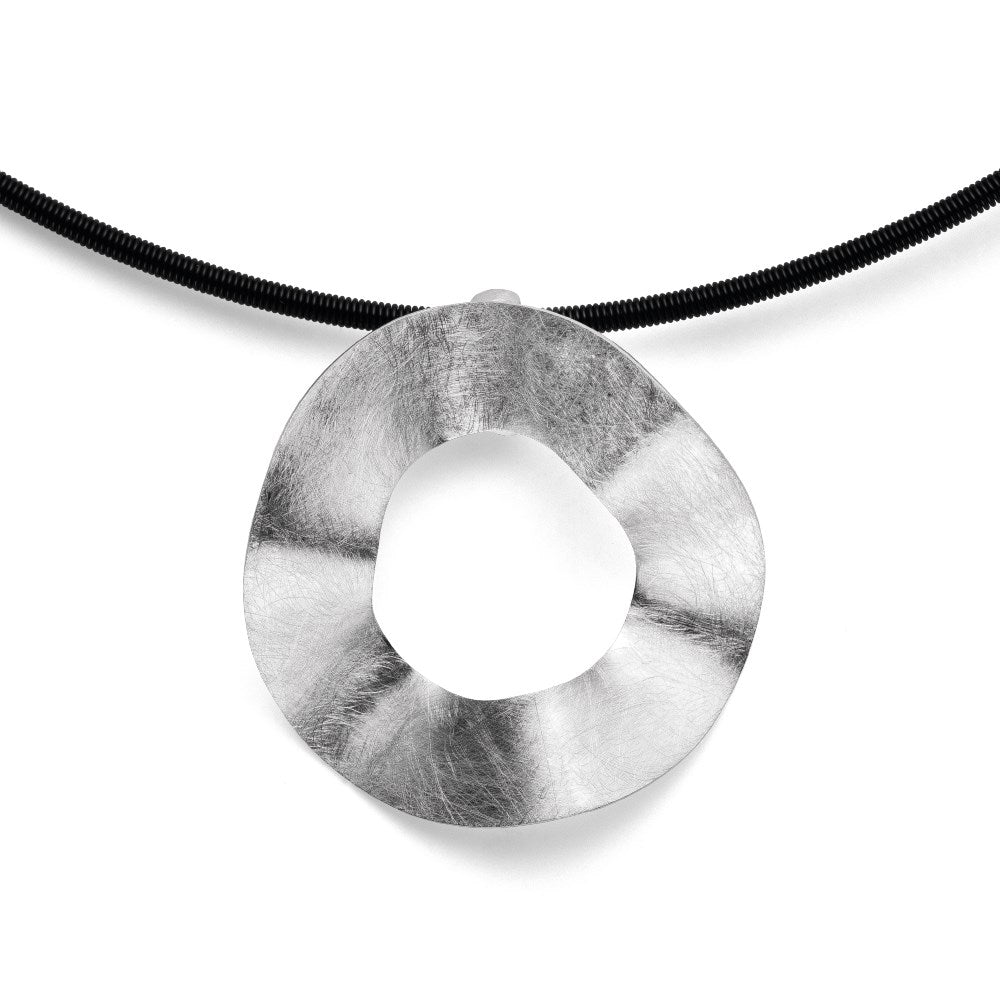 Modern and yet timelessly elegant: circular shaped pendant "Wavy Statement" made of scratch-matted 925/- sterling silver in a wavy design. Perfect in combination with the matching statement ear studs from the same design series by Düsseldorf designer Nadine Resch.