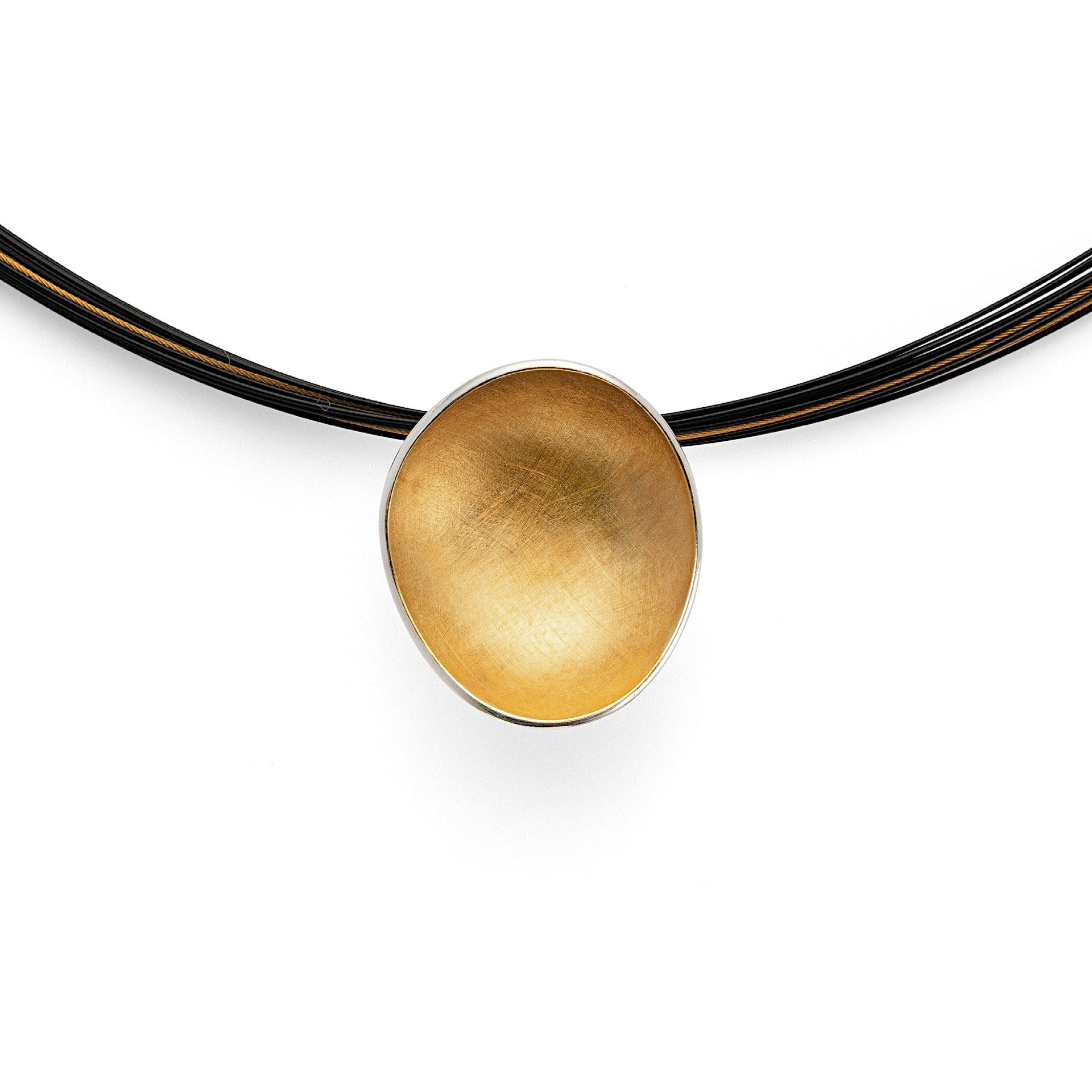 Golden Bowl Collection' - this geometrically shaped pendant made of gold-plated 925/- sterling silver impresses with its bicolor design in combination with a scratch-matt surface design. The not exactly circular design and the inward curvature emphasize the particularly handcrafted character of the pendant. The hidden suspension on the back also ensures a particularly sporty and elegant expression of the piece of jewelry, which was designed by the Osnabrück designer Dietmar Sebastian. Available with matching earrings and a matching ring.