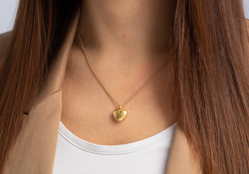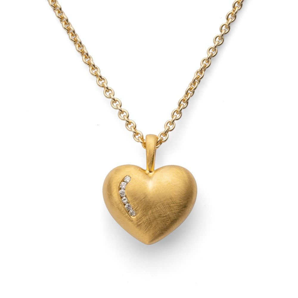 Symbolic jewelry is becoming increasingly popular because hardly any other gift can express love and affection as well as jewelry in the form of a small emotional message. Heart-shaped jewelry is perfect for this. This timeless heart pendant made of scratch-matted and 18 carat yellow gold-plated 925/- sterling silver impresses with its original, loving details and consistently high-quality workmanship. A total of 6 sparkling diamonds arranged asymmetrically in a curved row (0.005ct each, total 0.03ct, W-SI) are the icing on the cake of this piece of jewelry. A cute yet sophisticated design by German designer Nadine Resch.