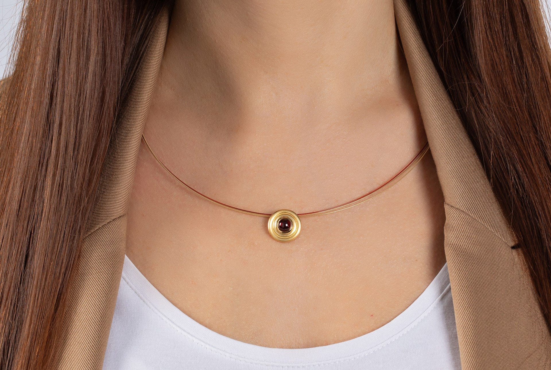 The new Eve Glow Collection by designer Thomas Mayer is geometrically inspired. Matted and polished 925/- sterling silver in an attractive ring look is crowned by a colorful cabochon-cut garnet weighing 1.38ct. The hidden suspension ensures the particularly elegant look of this attractive necklace. We recommend the appropriate accessory hoop for this trailer. Available with matching ear studs and a matching ring.