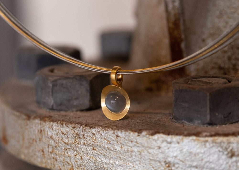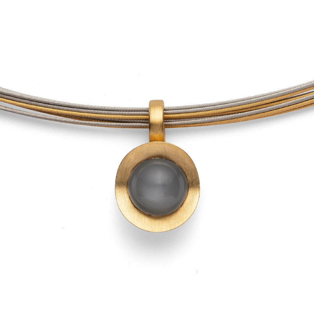 Timelessly elegant pendant from the designer Catherine Niegel - a centrally positioned gray moonstone with 2.30 ct, which is arranged in a gold-plated, matt setting made of 925/- sterling silver, becomes the real eye-catcher of this feminine piece of designer jewelry. Perfect in combination with the matching ear studs and ring.