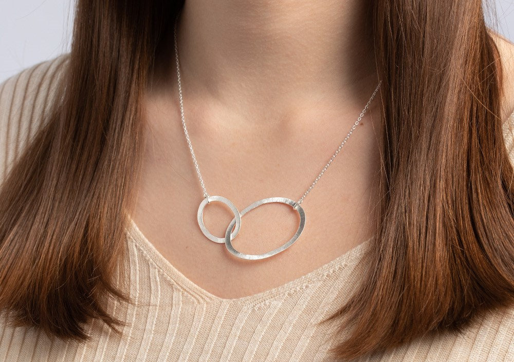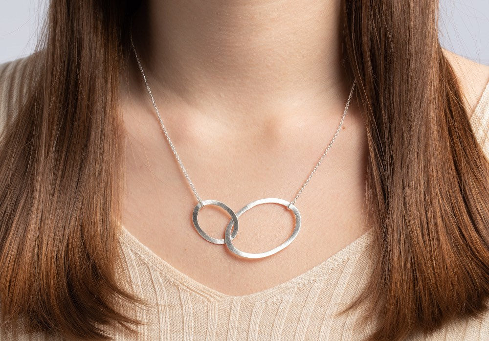 Modern, length-adjustable necklace "Eternity" made of two different sized, intertwined jewelry elements (design: Antje Liebscher) and lobster clasp. Especially in combination with the corresponding earrings, this pendant made of matt 925/- sterling silver, which is delivered including the round anchor chain on it (47 + 3 cm, diameter 1.5mm), is a real eye-catcher and jewelry all-rounder. p>