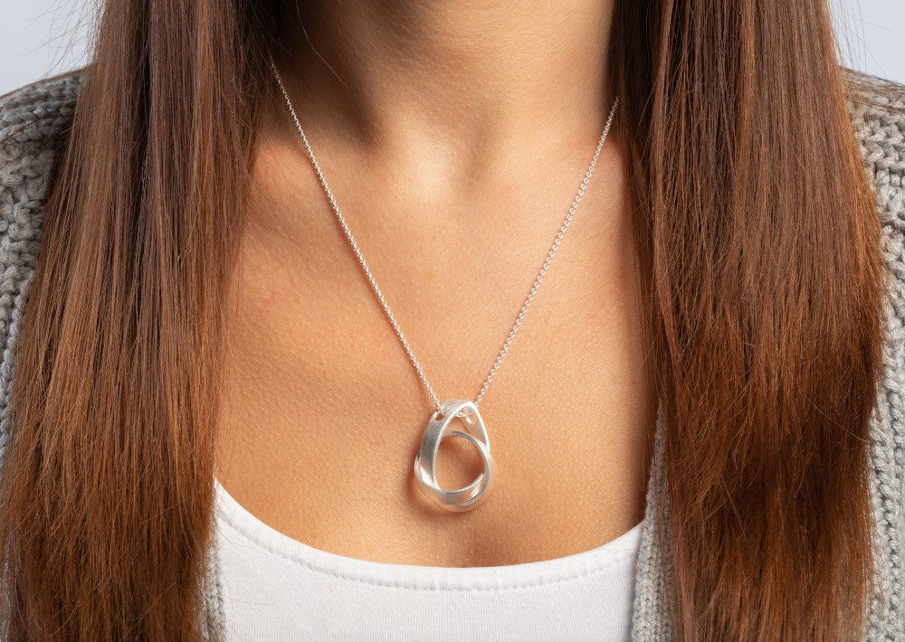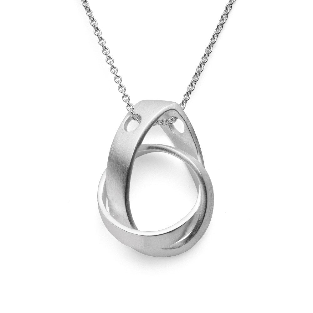 A cleverly twisted jewelry design from the pen of designer Catherine Niegel. Matted 925/- sterling silver in combination with a consistently dynamic shape gives the pendant a unique charisma. Whether sporty for everyday life or elegant for the evening - this designer pendant impresses for every occasion! Available in a set with matching stud earrings.