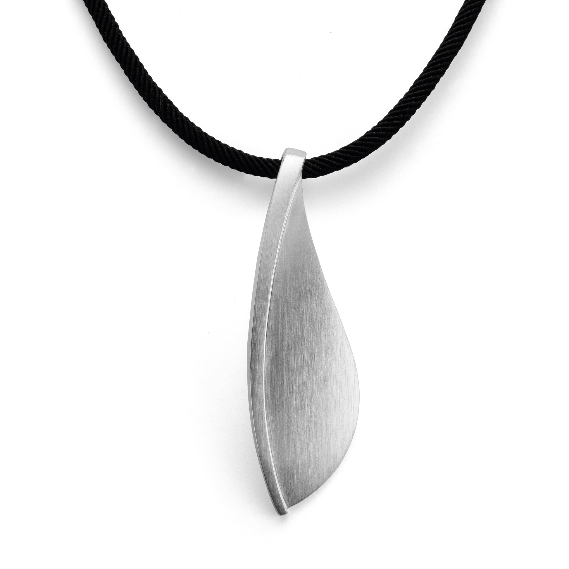 Matte 925/- sterling silver forms a sporty, elegant, 5cm long pendant from the pen of the designer and multiple Red Dot Design Award winner Dr. Sabine Brandenburg-Frank, which can be perfectly worn on a long chain or a longer ribbon. Available with matching ring and matching ear studs.