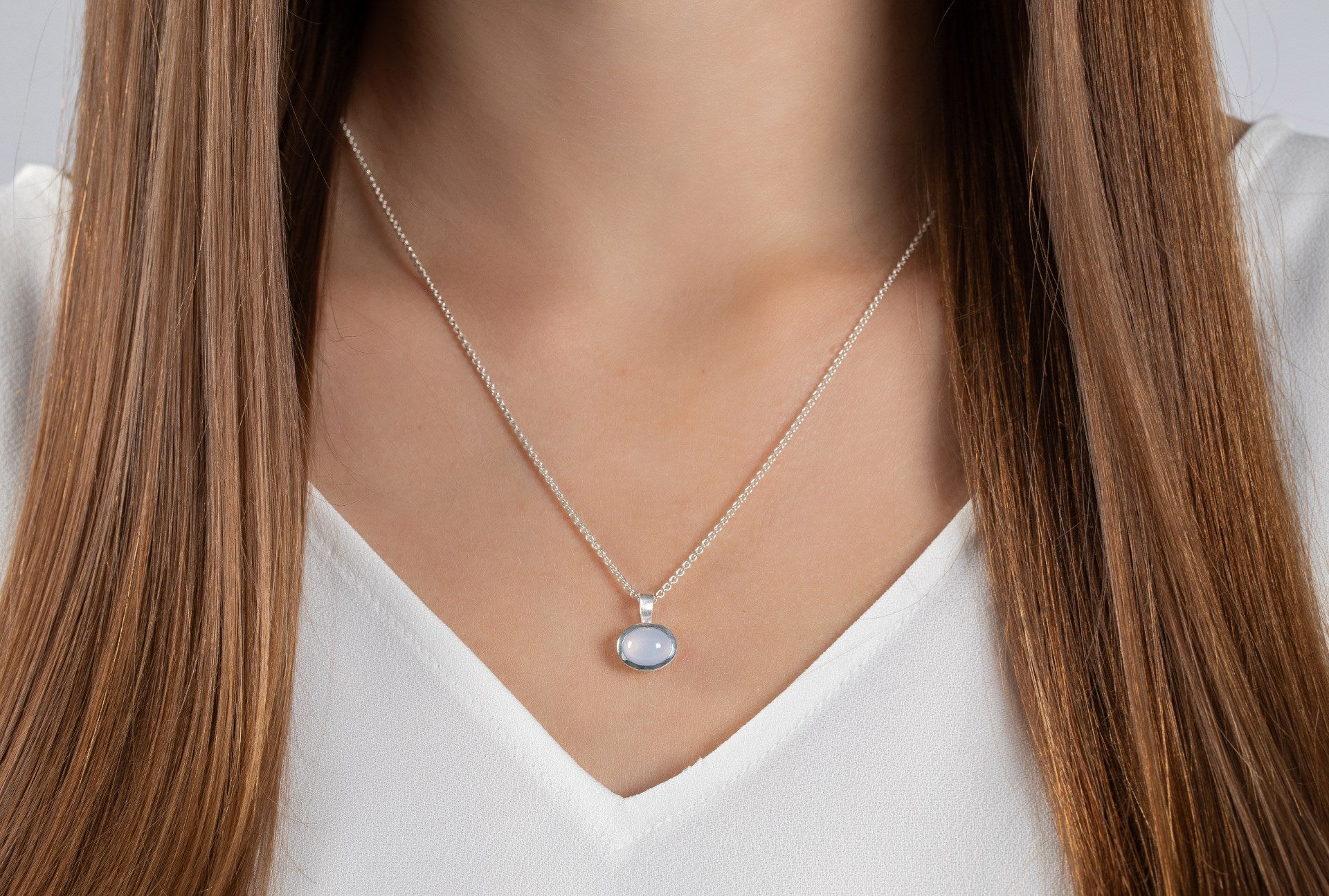 Timelessly elegant - a cabochon-cut chalcedony with 1.72 ct, which is arranged in a matt/polished setting made of 925/- sterling silver, becomes the real eye-catcher of this feminine piece of designer jewelry. Perfect in combination with the matching ear studs and the matching ring.