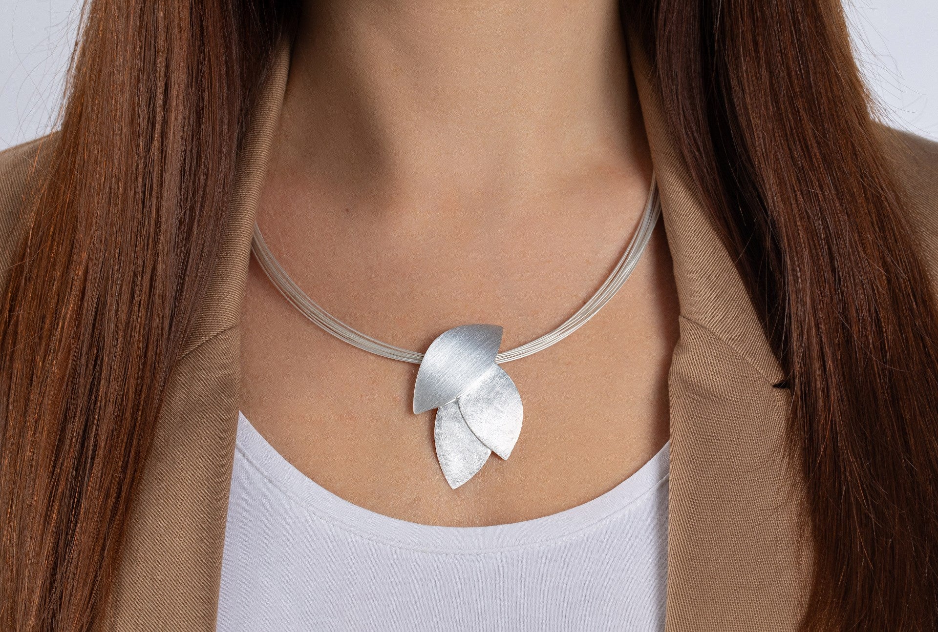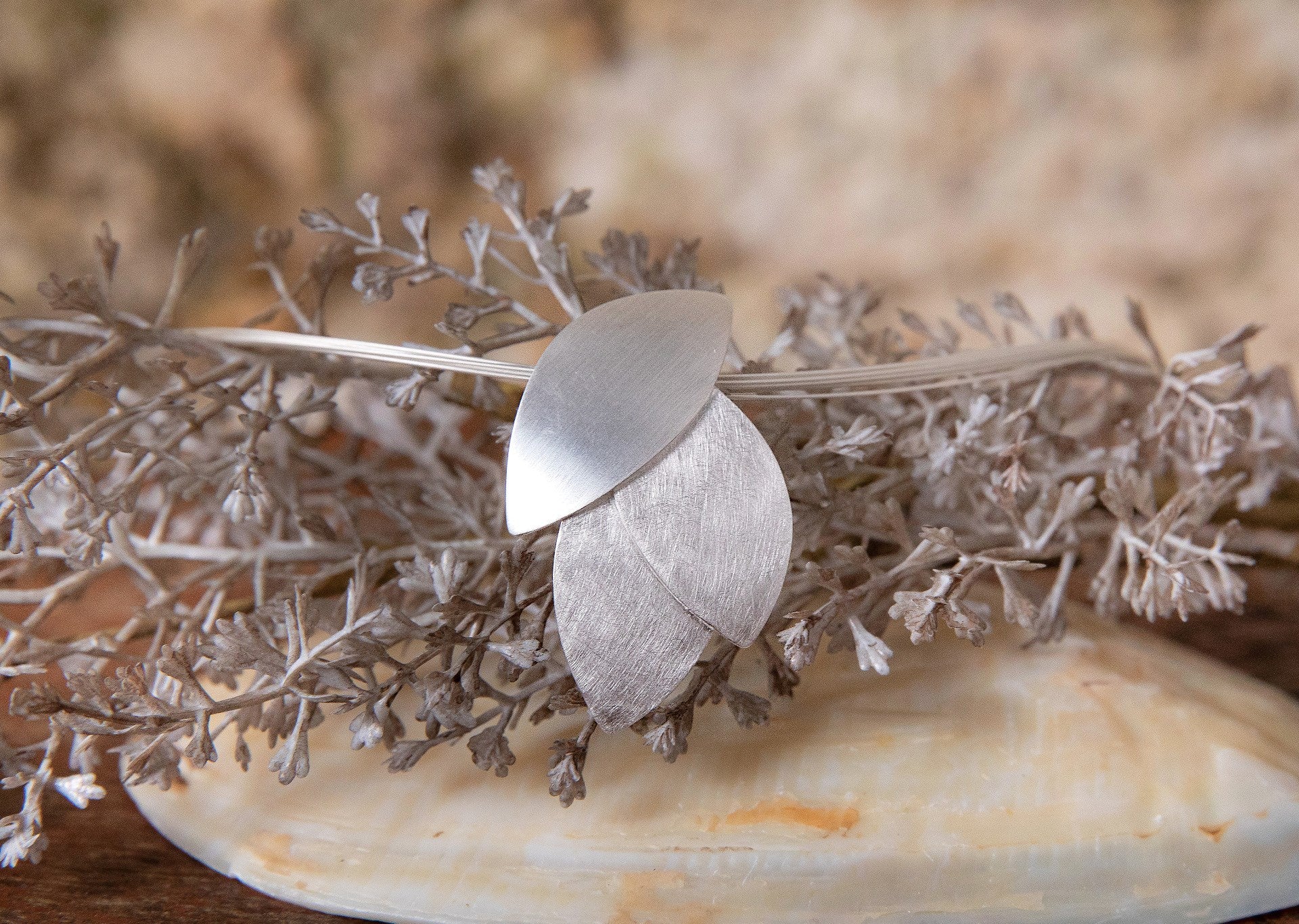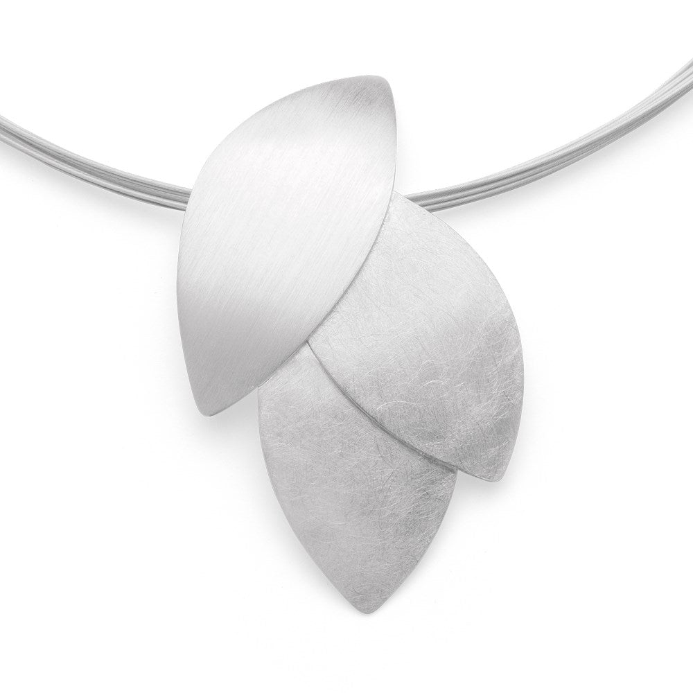 "Leaf by Leaf Collection" - a magical pendant made of 925 sterling silver meets a floral-inspired design language. The combination of matt and scratch-matt surface treatment ensures a particularly characteristic and unique appearance of the handcrafted piece of designer jewelry. A true jewelry all-rounder for many outfits. Available with matching ring, bangle and matching ear studs.