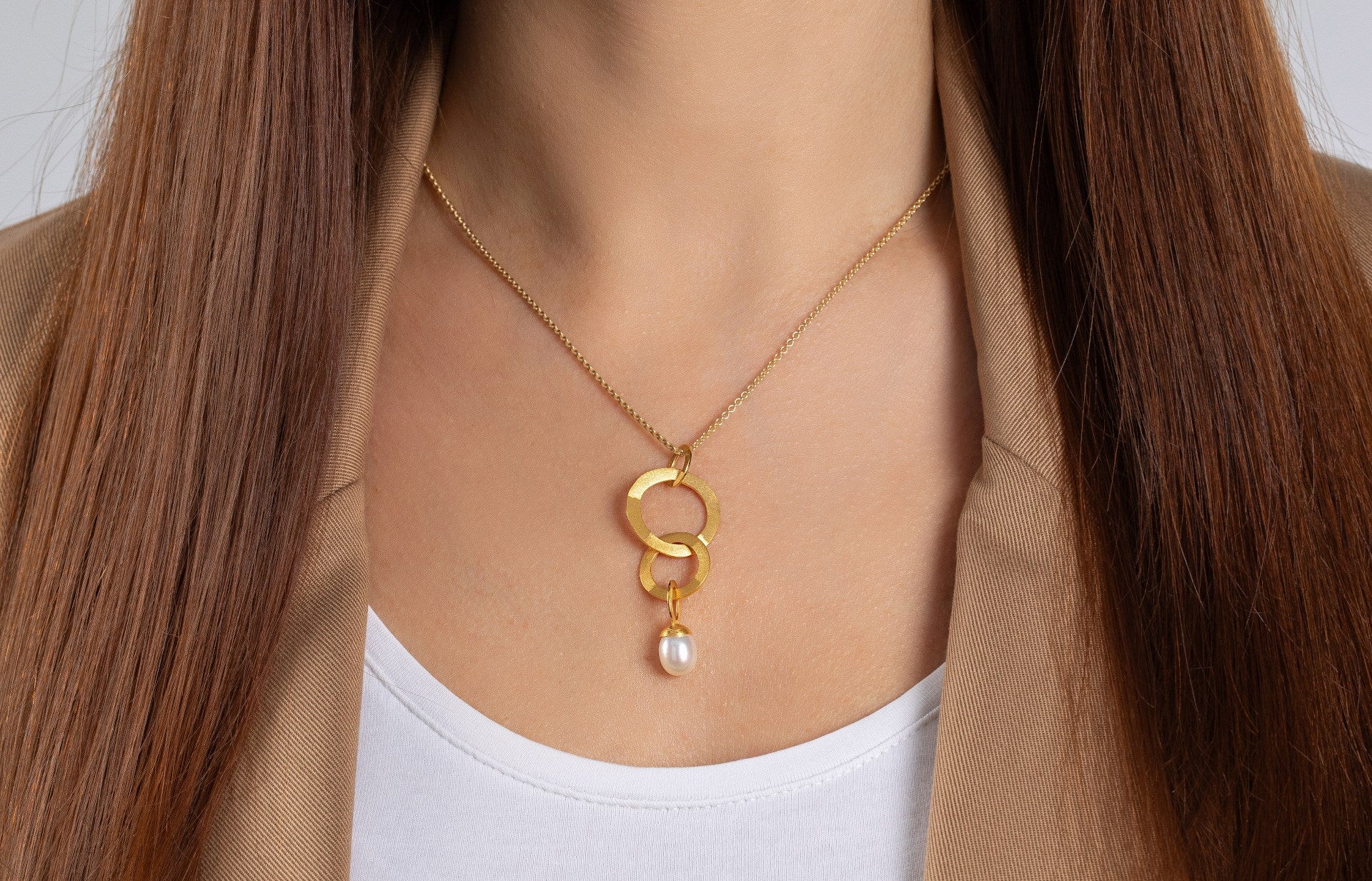 Geometrically inspired pendant with a fascinating surface and pearl highlight: Four interlocking and interplaying matt jewelry elements in different sizes create an elegant pendant with a white, shimmering freshwater cultured pearl. The hand-crafted, matt surface structure ensures the special charisma of the characterful piece of designer jewelry from the pen of designer Dietmar Sebastian. Available and perfect in combination with the matching ear studs.
