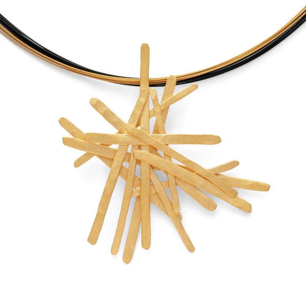Fine, elongated decorative elements made of gold-plated 925/- sterling silver combine to create this pendant from the Mikado Collection. The special uneven arrangement of the elements gives the piece of jewelry an individual, handcrafted and goldsmith's look. Available with matching stud earrings.