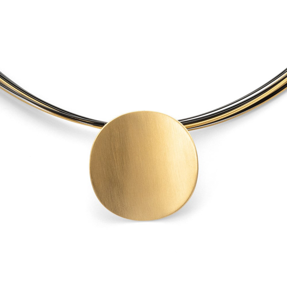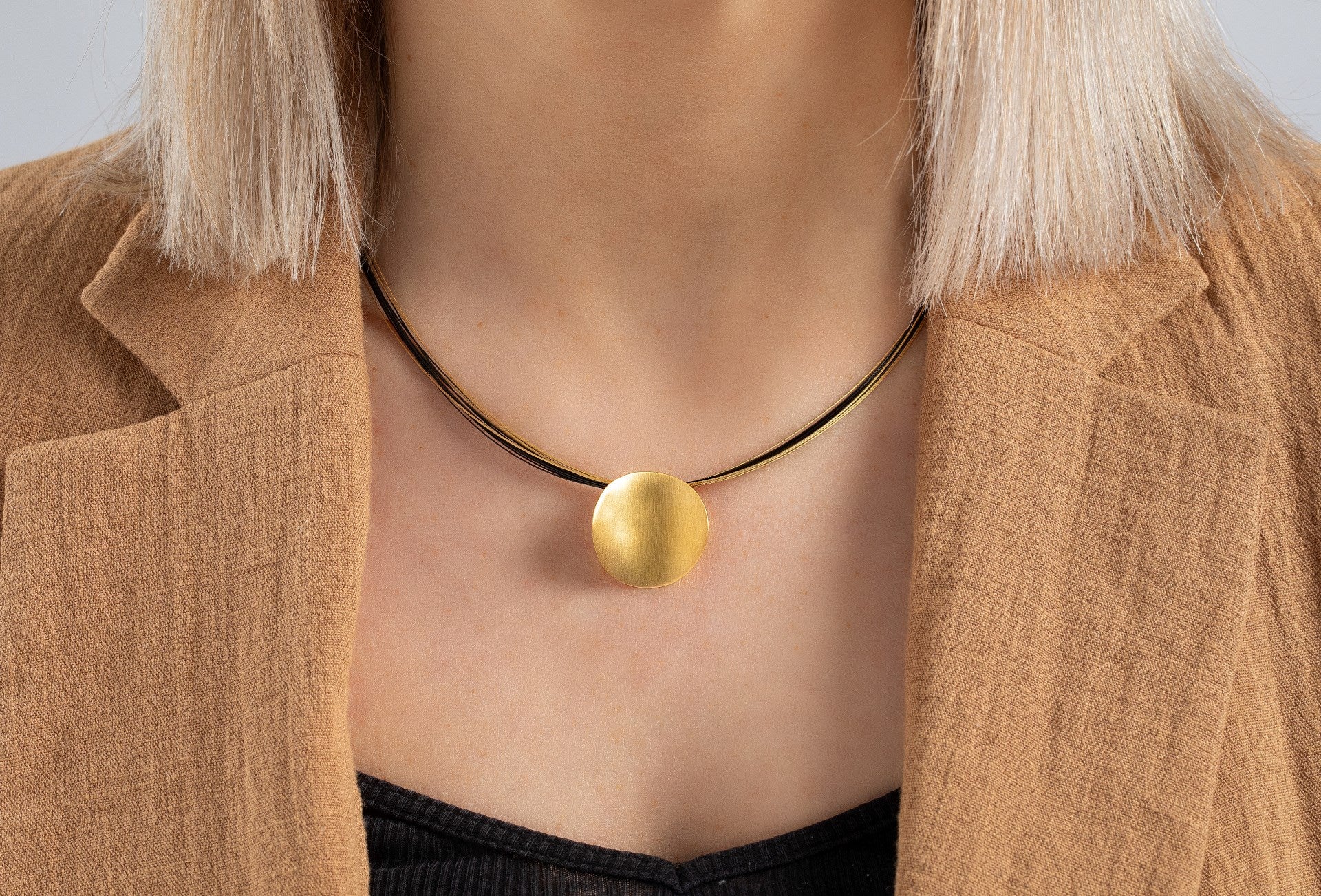 Stylish pendant in a slightly curved oval design made of matt and gold-plated 925 sterling silver. A timeless and at the same time elegant piece of jewelry from the designer Antje Liebscher, which proves to be the perfect accessory for everyday life. The hidden suspension ensures the particularly elegant look of this attractive necklace. We recommend an accessory hoop for this trailer. Available with matching ear studs and in pure silver.