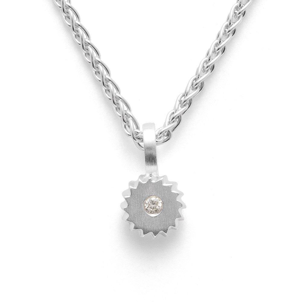 A consistently characteristic surface structure meets a sparkling and centrally positioned brilliant-cut diamond (0.02ct). Inspired by a goldsmith's tool, the designer Thomas Mayer enchants with his own signature. A valuable piece of jewelry with the makings of an absolute favorite piece of jewelry. Available with matching ear studs.