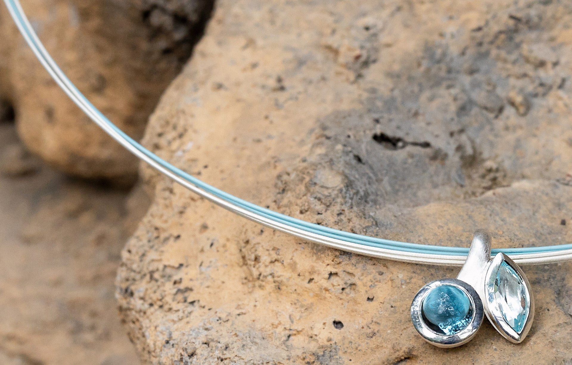 Elaborately crafted choker made of 5 fine, light blue and silver stainless steel strands, which are harmoniously brought together in a double clip closure. The new, practical closure type makes it particularly easy to open and close. Also available in other versions.