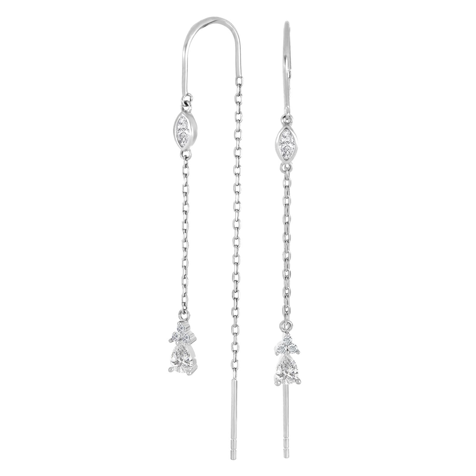 The finest earrings with cubic zirconia. At the top by the earlobe, there is an oval stone and at the end of the chain, two combined triangular stones dangle. These earrings are perfect at festive occasions where the nice dress is dug out from the closet. It can be a summer party or a wedding. You will without a doubt feel like a princess.