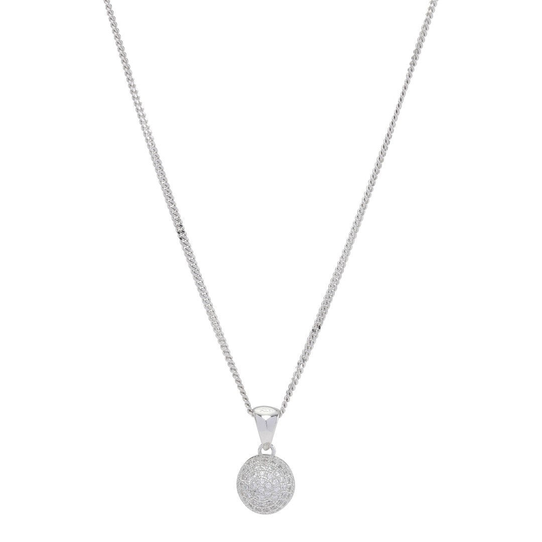 Give your outfit a little shine with this beautiful necklace from our Amola collection. The round pendant is studded with zirconia on the front side. The openness on the backside allows for reflection of light and make the zirconia shine. With this necklace in rhodium-plated silver you can add exclusivity to your everyday look.