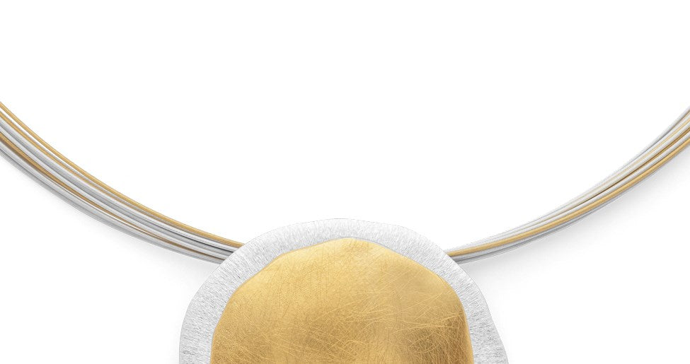 Elaborately crafted choker made of 16 fine, bicolor silver-plated stainless steel strands, which are harmoniously brought together in a double clip closure. The new, practical closure type makes it particularly easy to open and close. Also available in other designs.