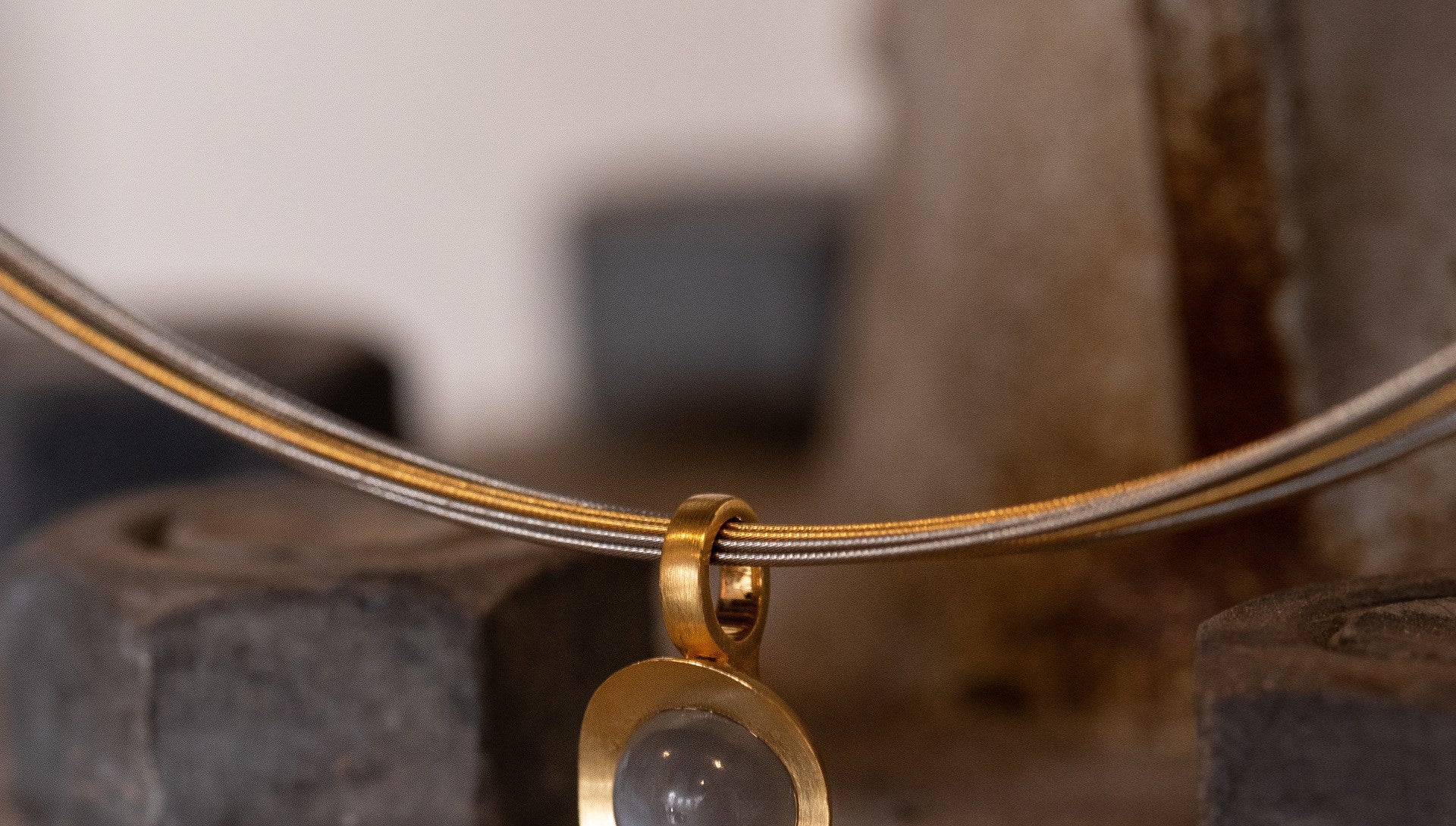 Elaborately crafted choker made of 12 fine ropes made of bicolor stainless steel strands, which are harmoniously brought together in a double clip closure. The new, practical closure type makes it particularly easy to open and close. Also available in other designs.