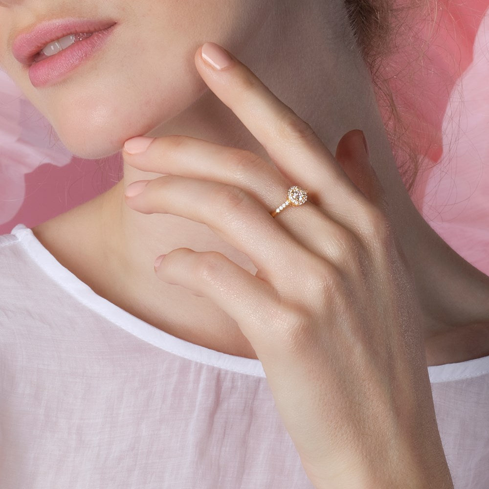This ring is captivating, feminine and outstanding. The big stone is encircled by multiple smaller stones which gives the ring an exclusive look. Stones have also been placed along the ring, which is the icing on the cake.